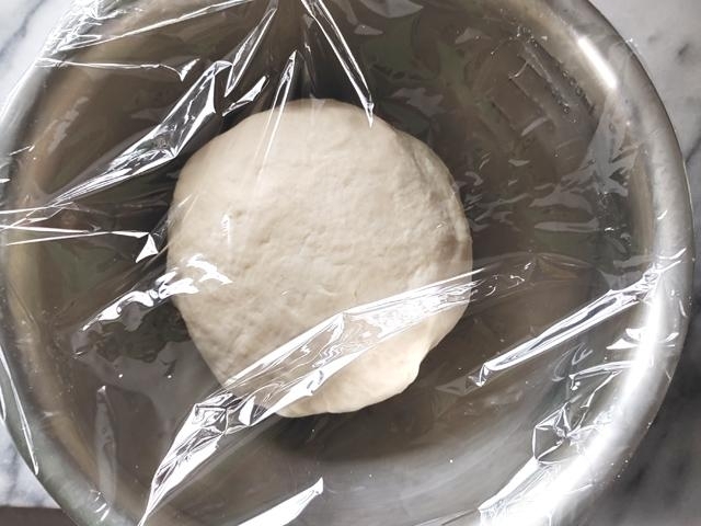 大きめのボールに薄く油(分量外)を塗って、生地を入れ、ラップをして、35度のオーブンで、60分ほど発酵させる。