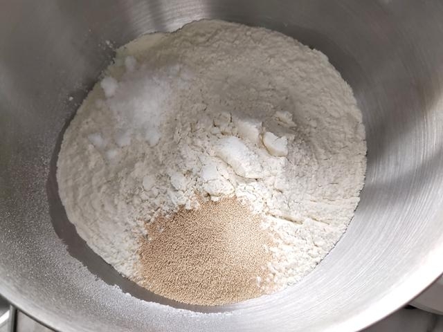 スタンドミキサーのボールに、強力粉、上白糖、ドライイーストを入れ、箸などで軽くかき混ぜる。