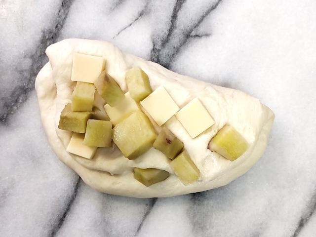 閉じて半円になったら、その上にもサツマイモとチーズ(1/20量で合計1/10量になります)を乗せ、全体を丸めるようにして成形する。
