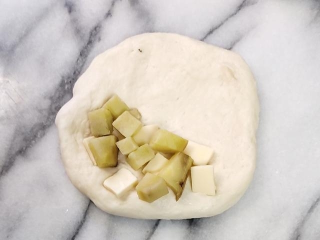 生地をめん棒で円くするか、手のひらで潰して円くしたら、片側にサツマイモとチーズ(1/20量)を乗せ、もう片方の生地で蓋をする。