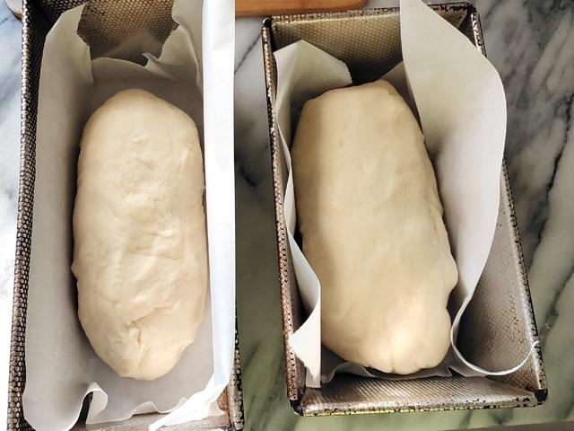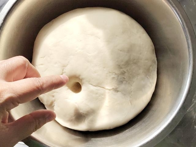 生地が二倍くらいに膨らみ、指で押してみて、穴が戻らないようなら発酵完了。