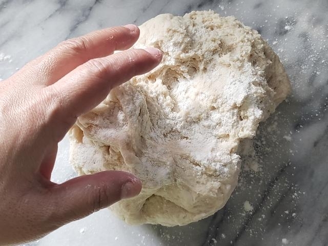 台に軽く強力粉(分量外)を振って生地を取り出し、生地の上にも軽く打ち粉をして、表面が滑らかになるまで、5分ほど捏ねる。
