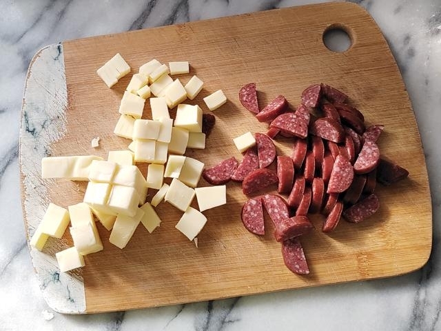 プロセスチーズは、小さめの角切りにし、サラミも同じくらいの大きさになるように、半月切りにする。