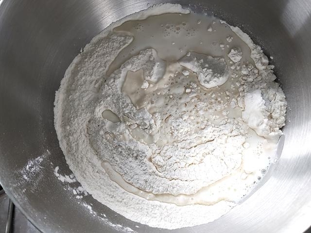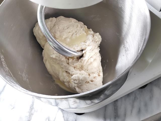 スタンドミキサーに、ドゥーフックを付けて、低速で捏ね始める。