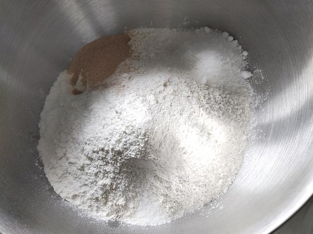 スタンドボールに、強力粉、ドライイースト、塩(イーストの反対側に)を入れて、軽く混ぜ合わせる。