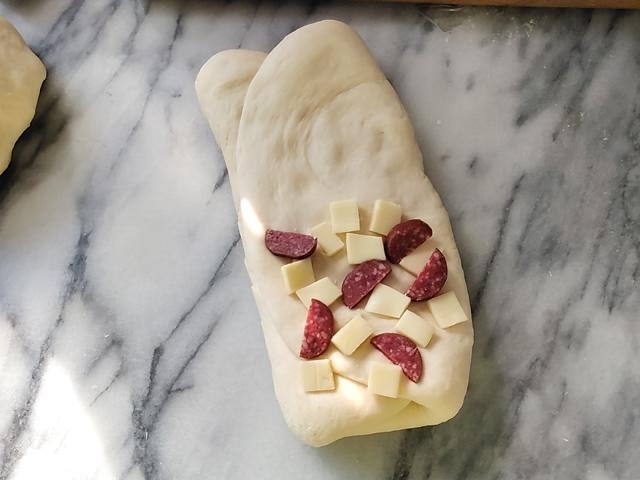 生地を1つ取り、長方形に伸ばしたら、等分したチーズとサラミの半量を埋め込むように散らす。