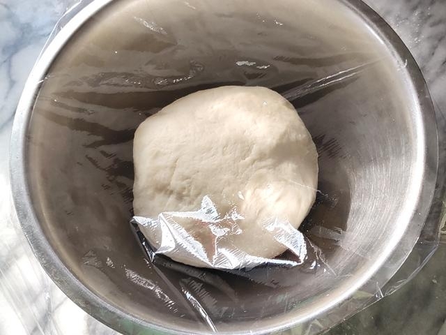 軽く手でパンチしてガス抜きをしたら、二等分して丸めて、固く絞った濡れ布巾をかけて、15分ほど置く。