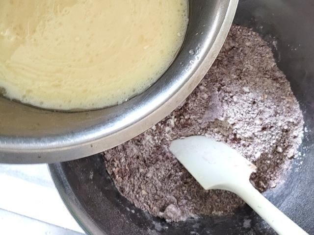 別の大きめのボールに、二種の砂糖と薄力粉、重曹、カップケーキ用のココア、塩を混ぜ、更に先に作ったヨーグルト液を加えながら、しっかり混ぜる。