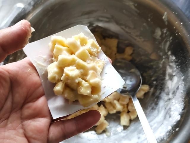 待っている間に、人数分の皿(8cm角ぐらいの大きさ)をクッキングシートで作っておく。