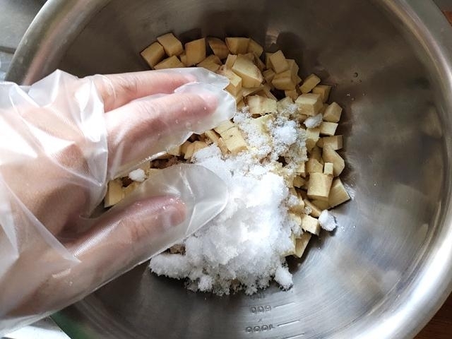さつまいもをざるにあげ、水を切ったボールに、上白糖と塩と共に入れ、手袋をはめて、手で全体になじむまで混ぜる。