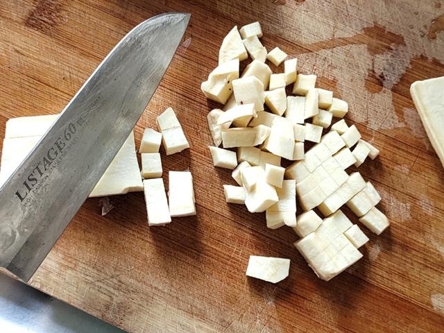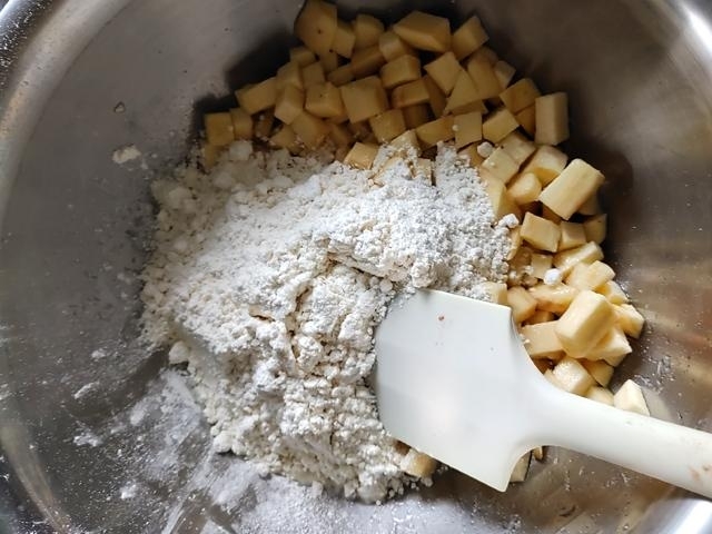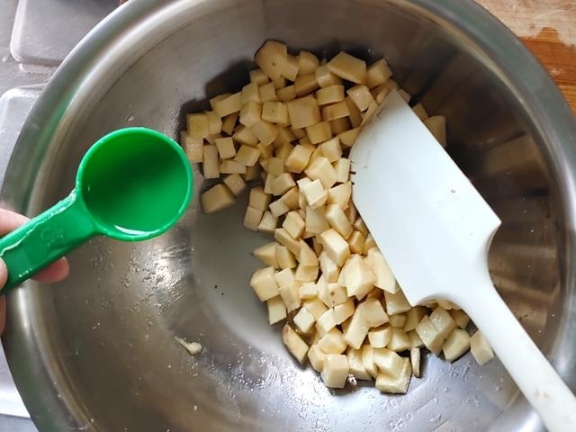 さつまいもを、8mm角に切り、レモン汁を入れたボールに入れて、15分ほど晒しておく。
