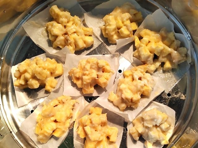その間に、シートに12等分した生地を乗せ、1つずつ蒸し器に並べる。