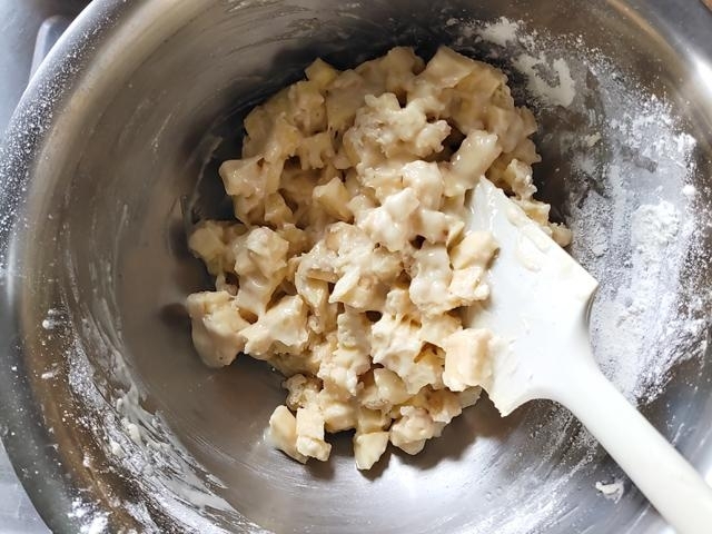 ボールに薄力粉を加え、ゴムベラで、なじむまでしっかり目に混ぜる。