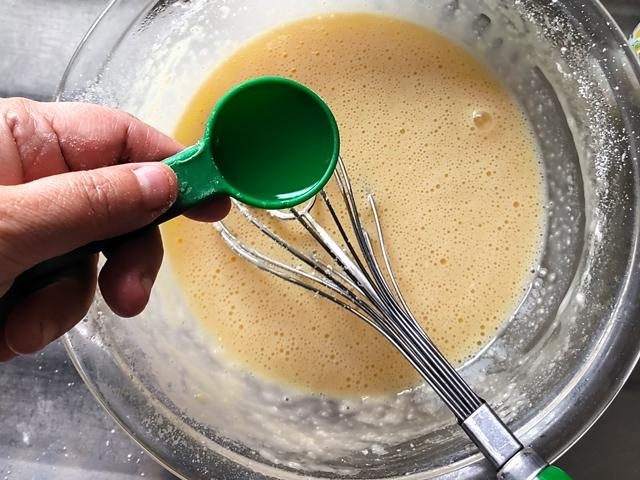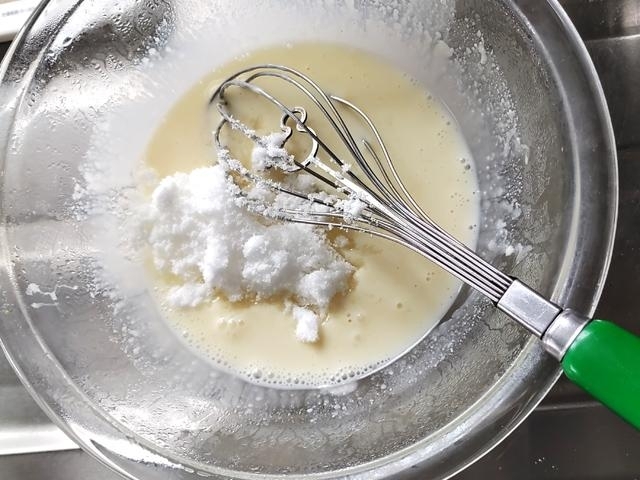 ボールに砂糖を加えて、ざらざら感が消えるまでしっかりと混ぜる。
