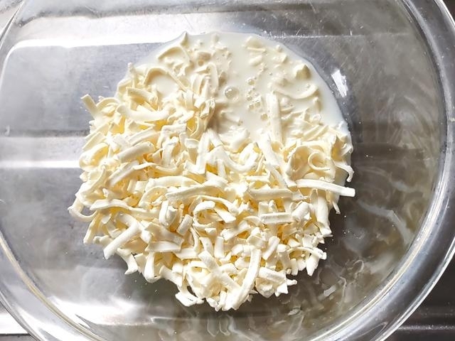 耐熱ボールにピザ用チーズと牛乳を入れ、600wのレンジで2分加熱する。