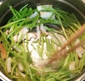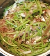 ※さつまいものつるが柔らかくなる迄に焦げそうになってきた場合は、水か酒を少し追加して下さい。