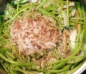 砂糖・麺つゆ・みりん・かつお節・白炒りごまを加えて混ぜ、汁気が無くなるまで加熱する。