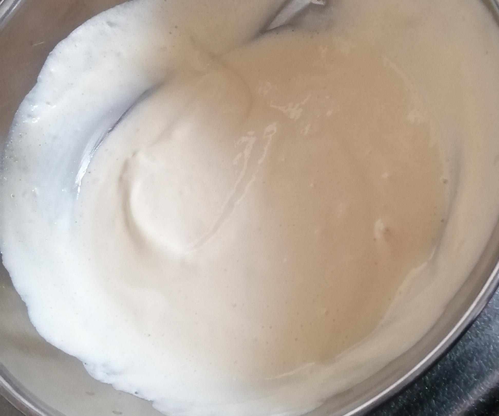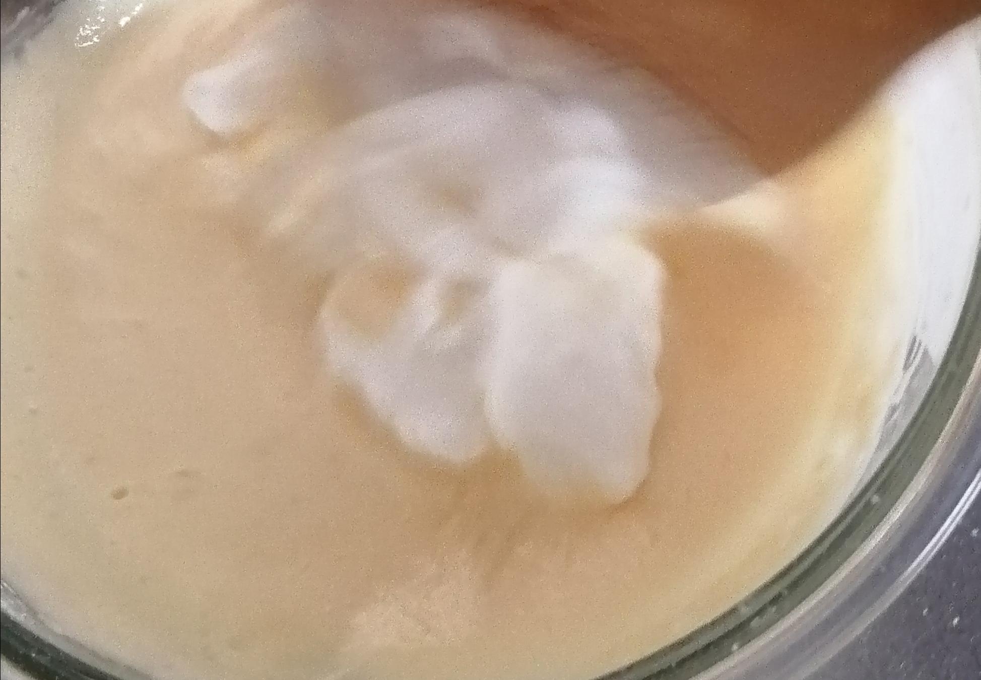 ・次に残りのメレンゲの半分を更に加えて、ヘラ等でさっくり混ぜる。(メレンゲの泡を潰さないように、切るよう。)