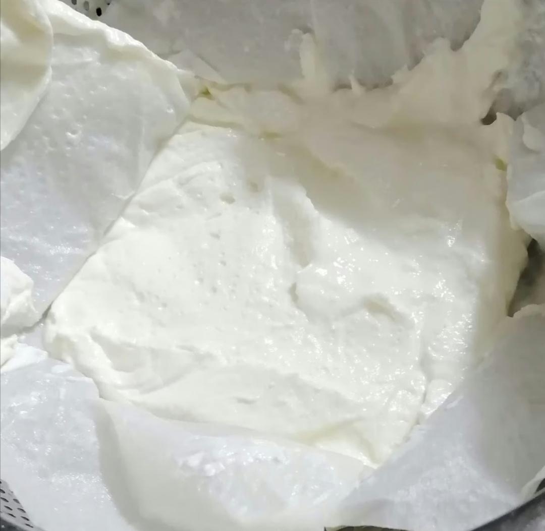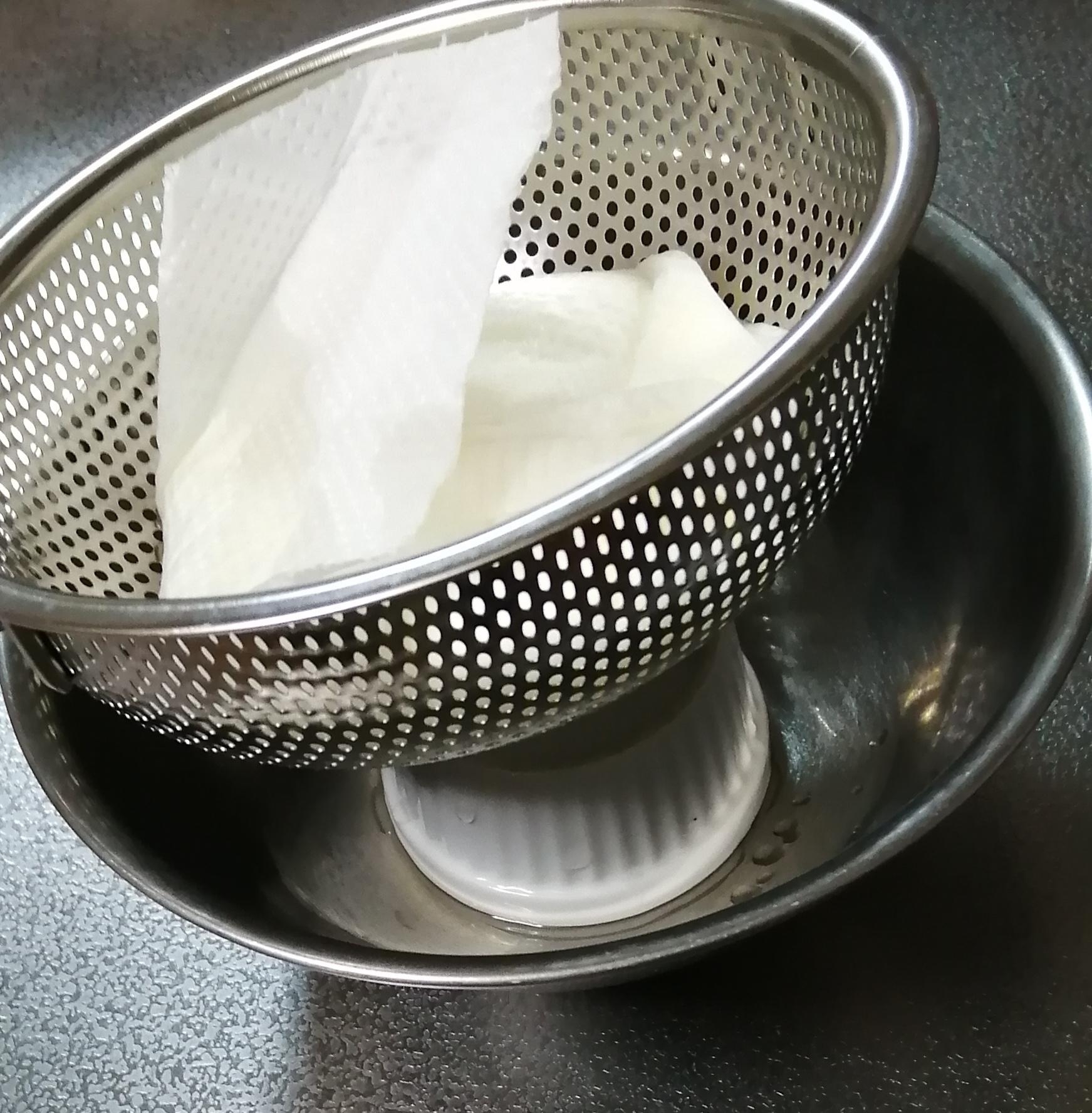 ボウルにザルを乗せてキッチンペーパーを敷き、ヨーグルトを乗せて包み、一晩程度冷蔵庫で放置する。