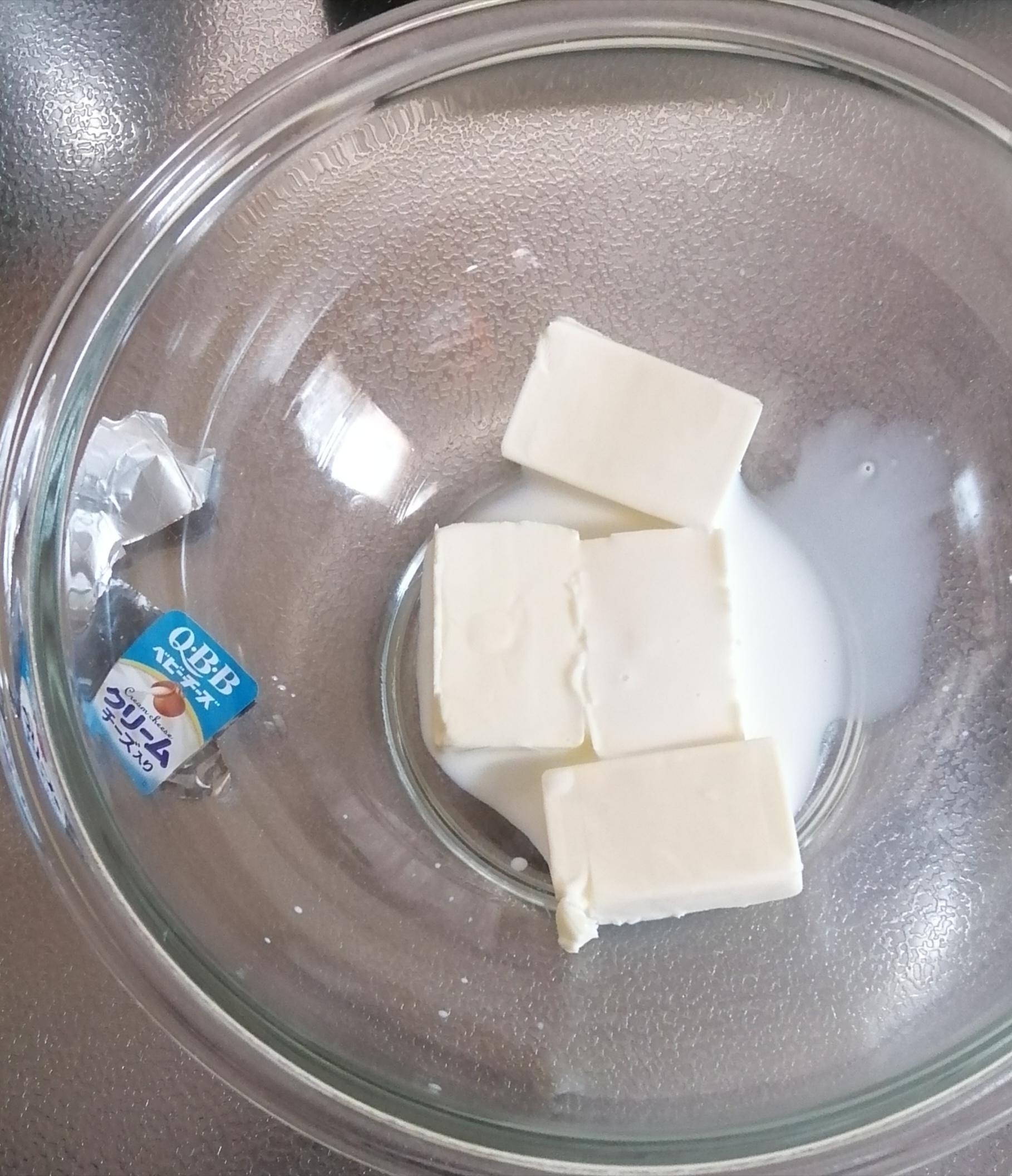 耐熱ボウルにベビーチーズと牛乳を入れ、電子レンジ600Wで40秒加熱して混ぜ、なめらかにする。