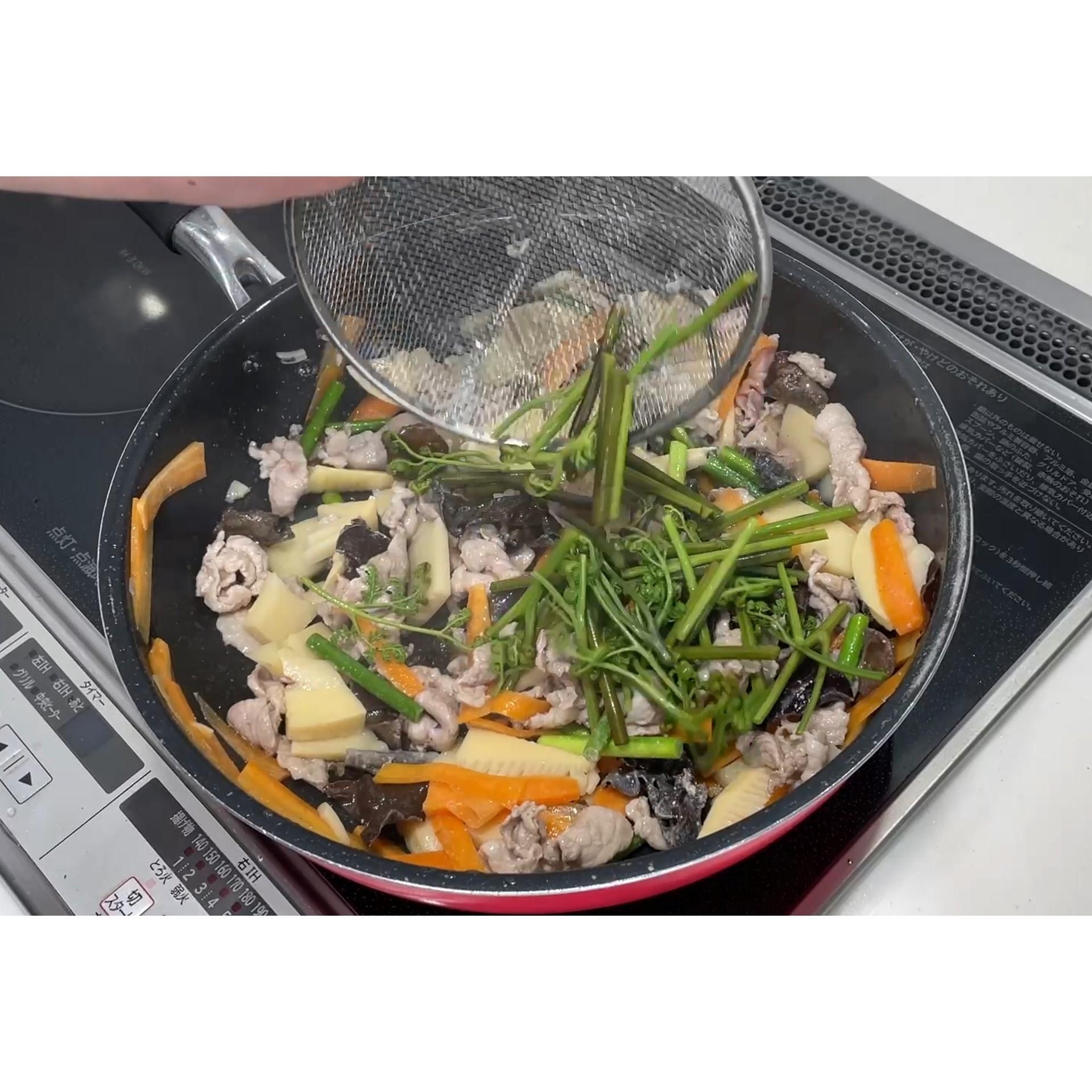 フライパンにわらびを入れます。
