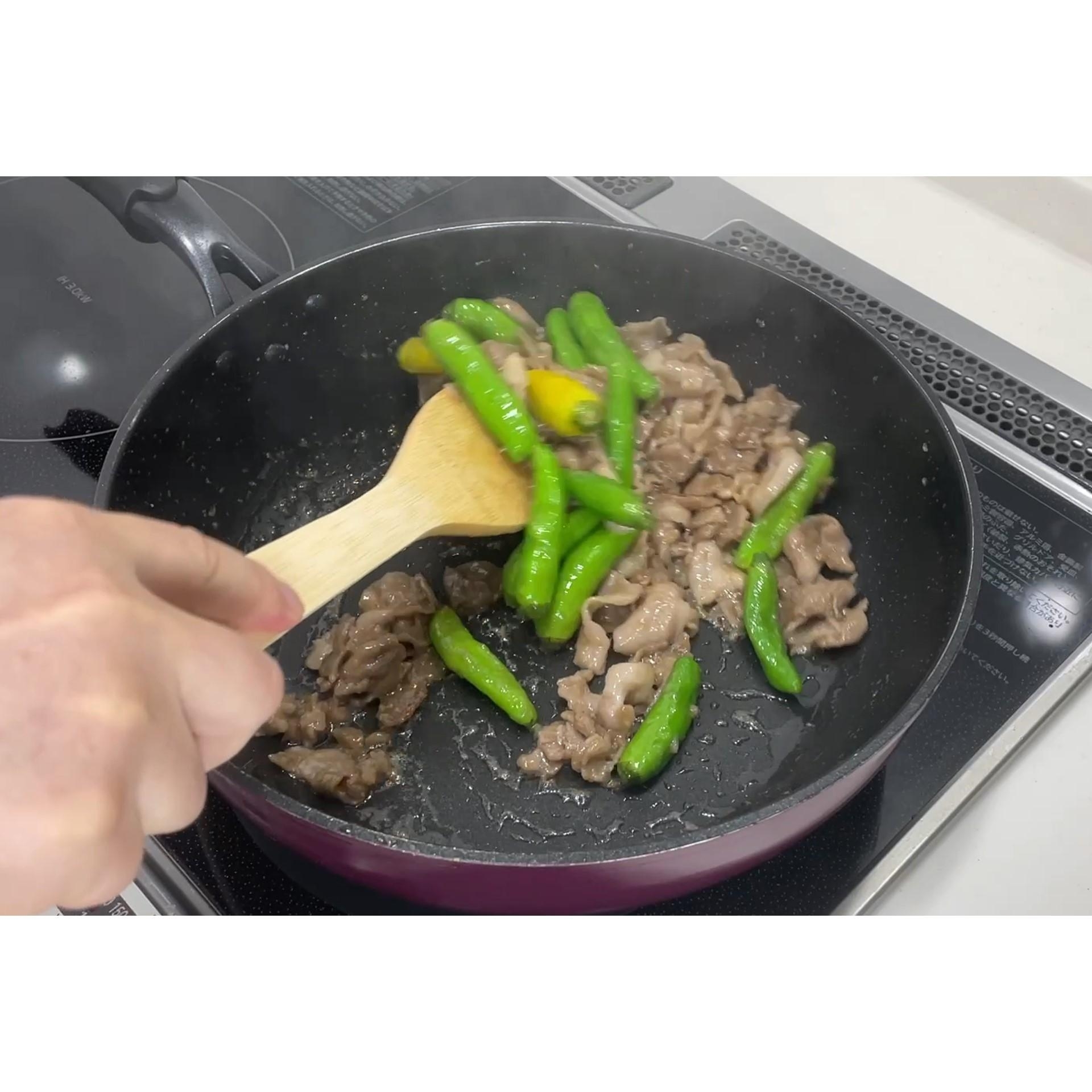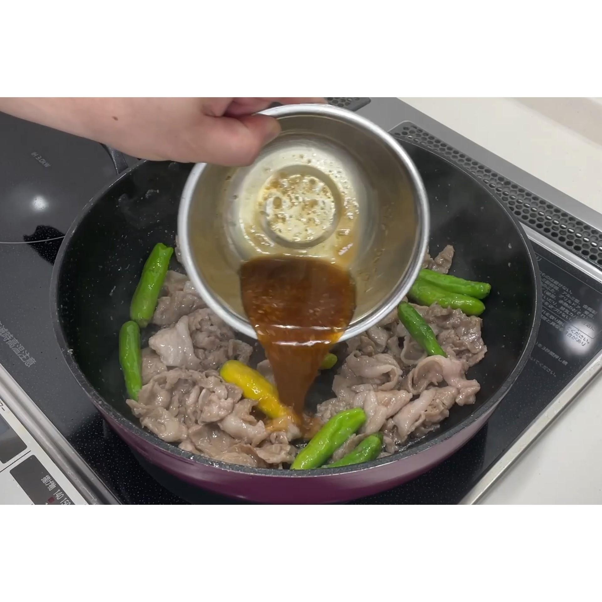 豚肉とししとうを混ぜて★調味液をからめます。