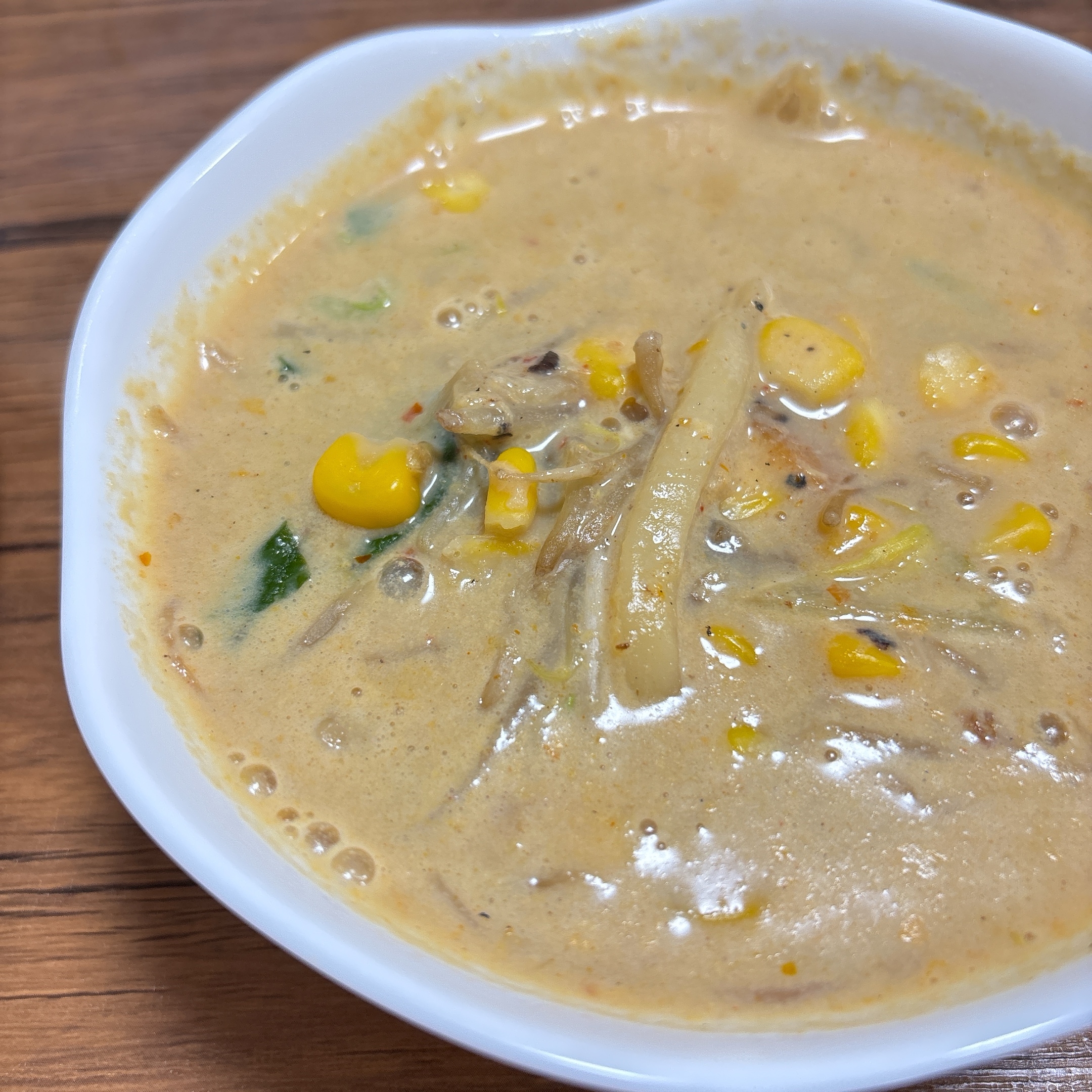 おい〆は…豆乳スープっ!残り汁にお好みで白菜やもやし、コーンなも入れ→豆乳300ml、塩胡椒で味を整え出来上がり⭐︎