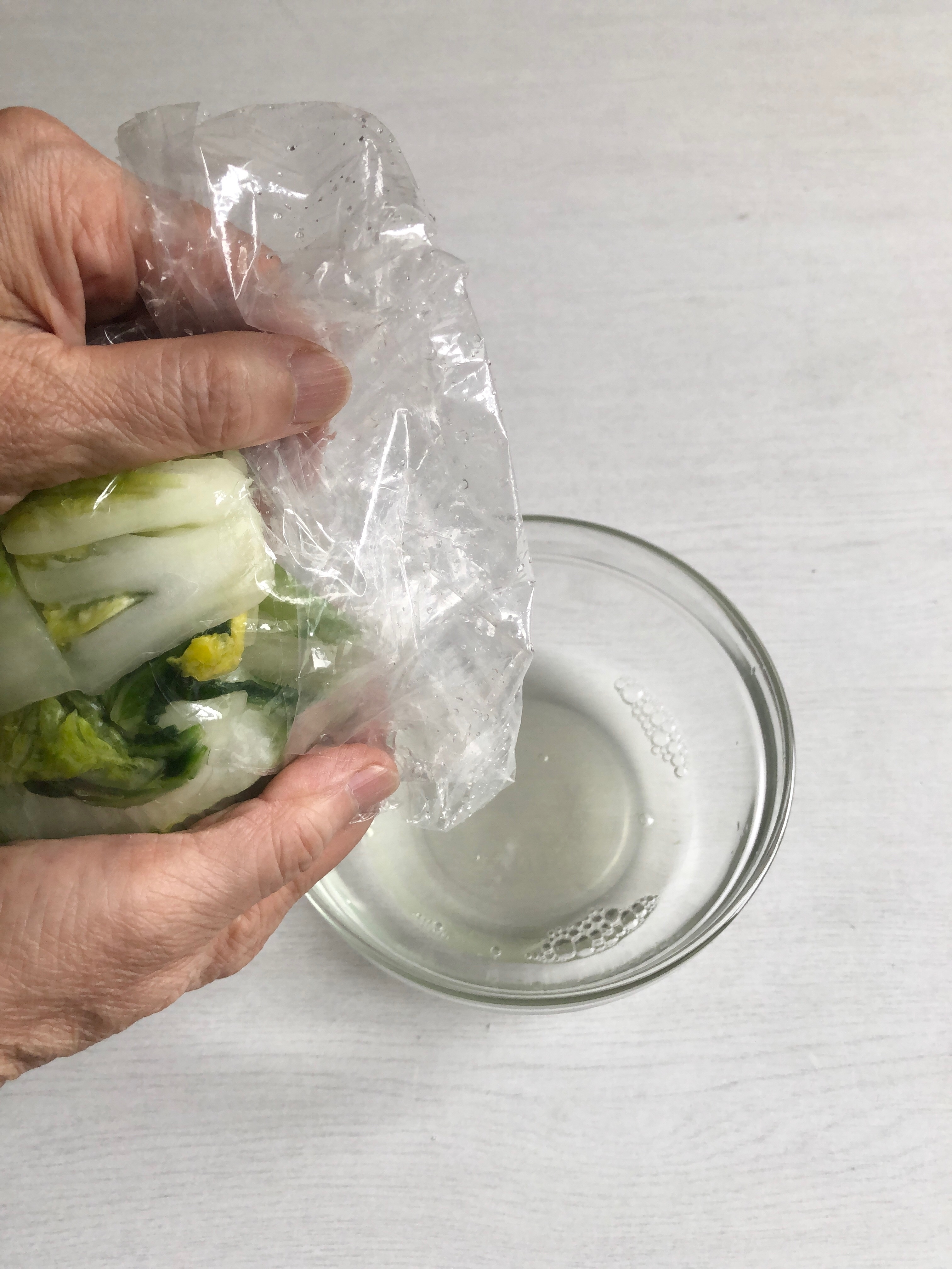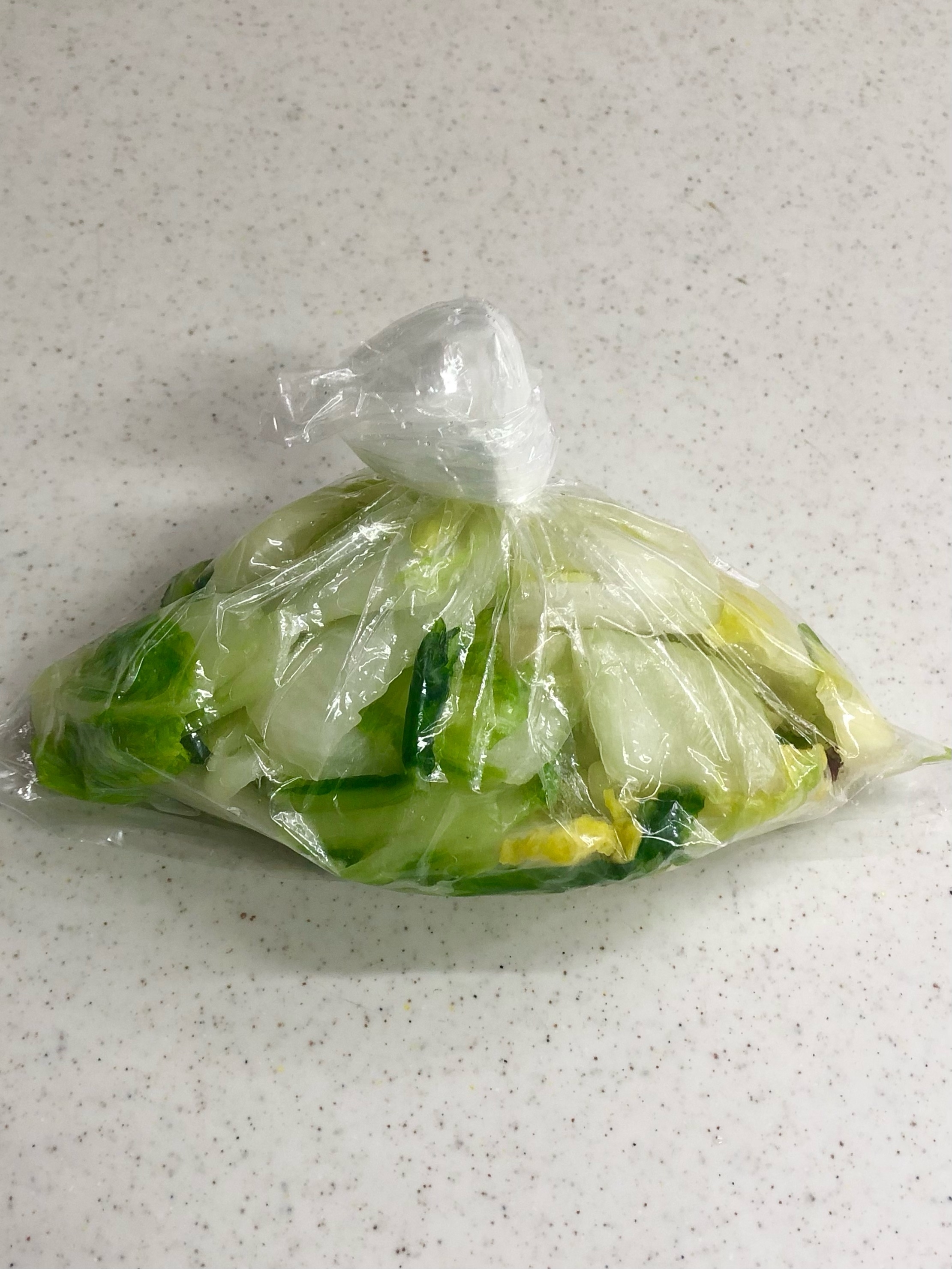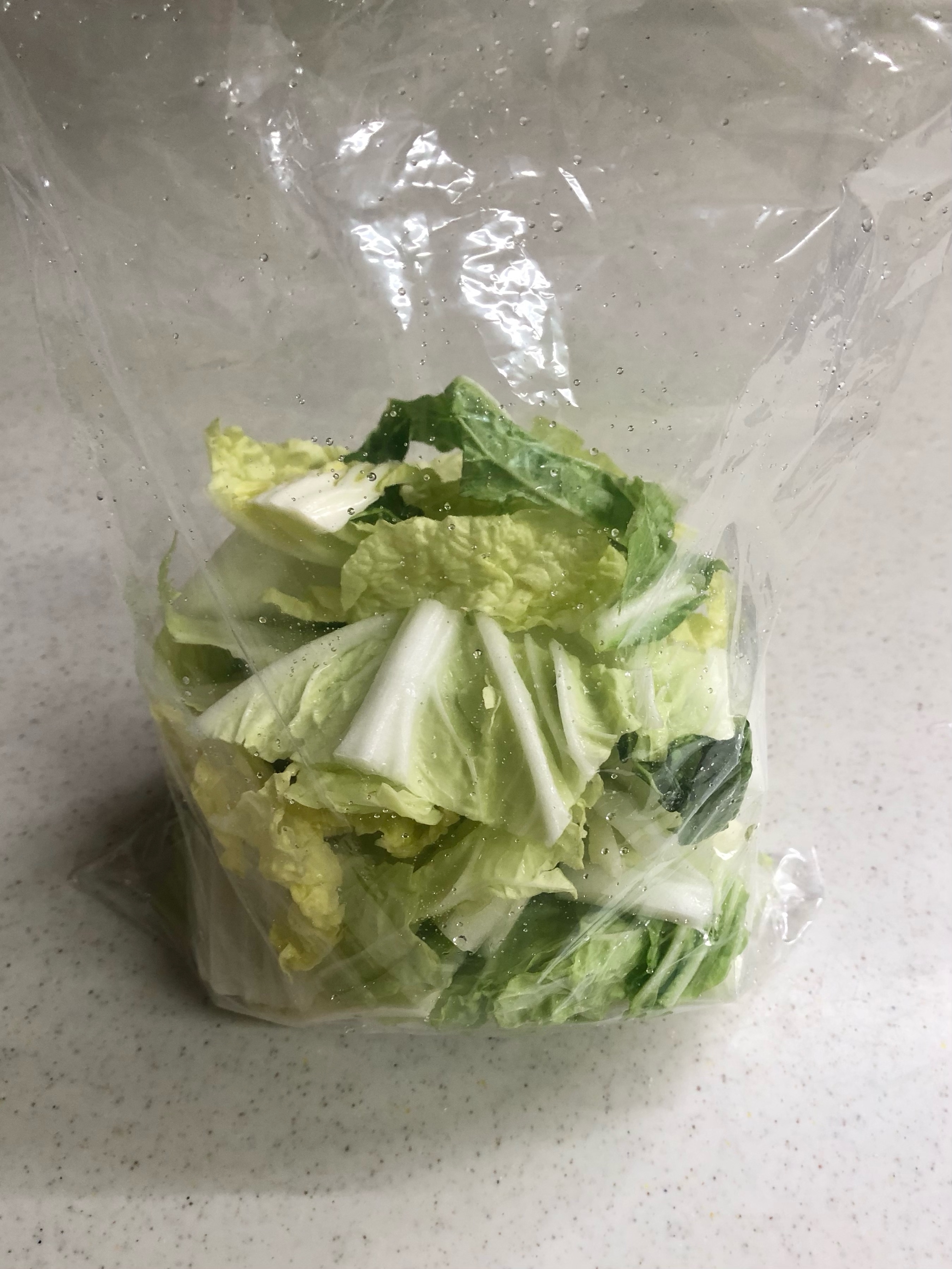 丈夫なビニール袋に白菜を入れて塩を加え振り混ぜる。