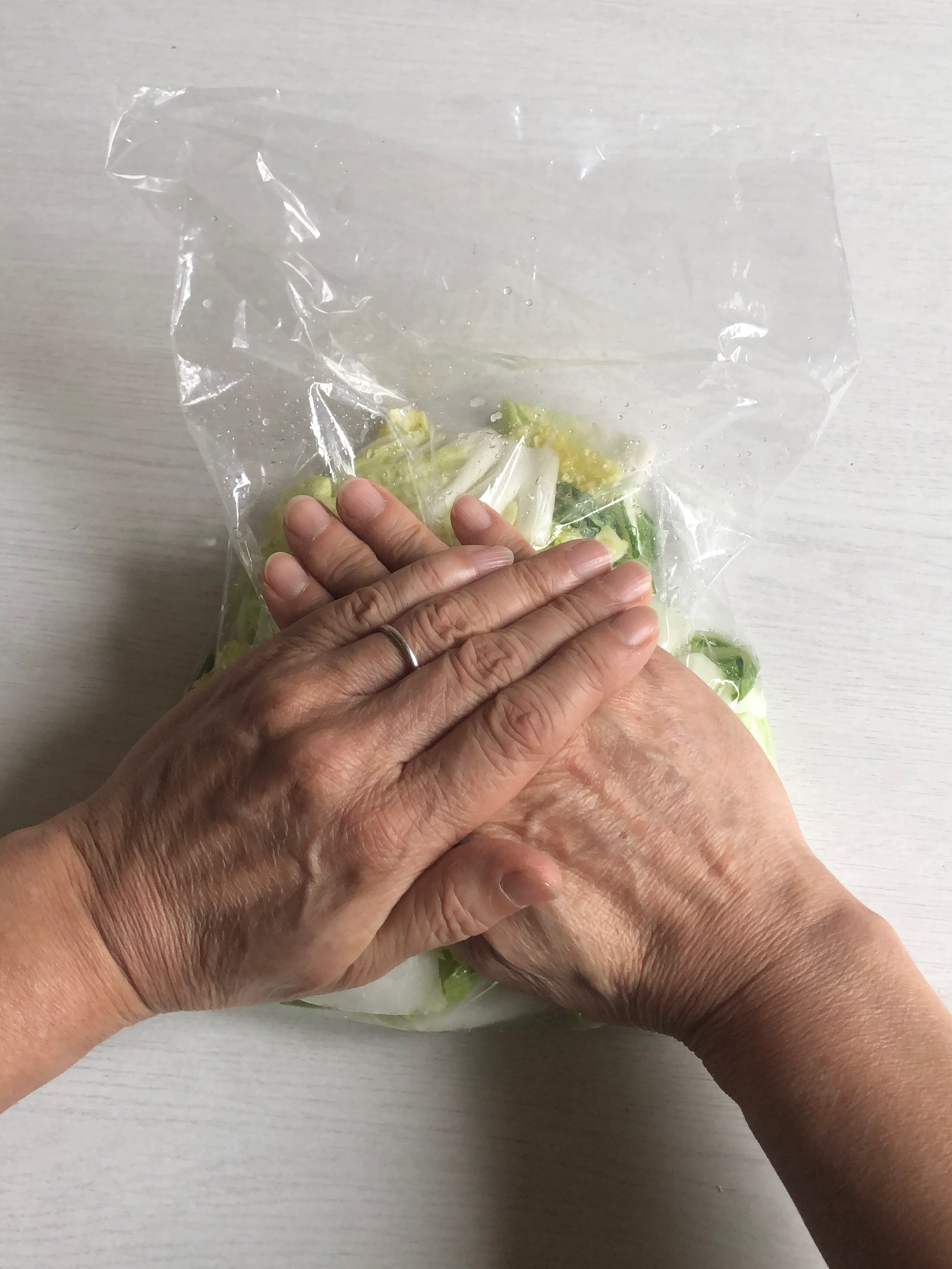 袋の口を閉めずに置き、全体重を乗せてゆっくり押す。10回ほど押して塩が馴染んだら両手で揉む。