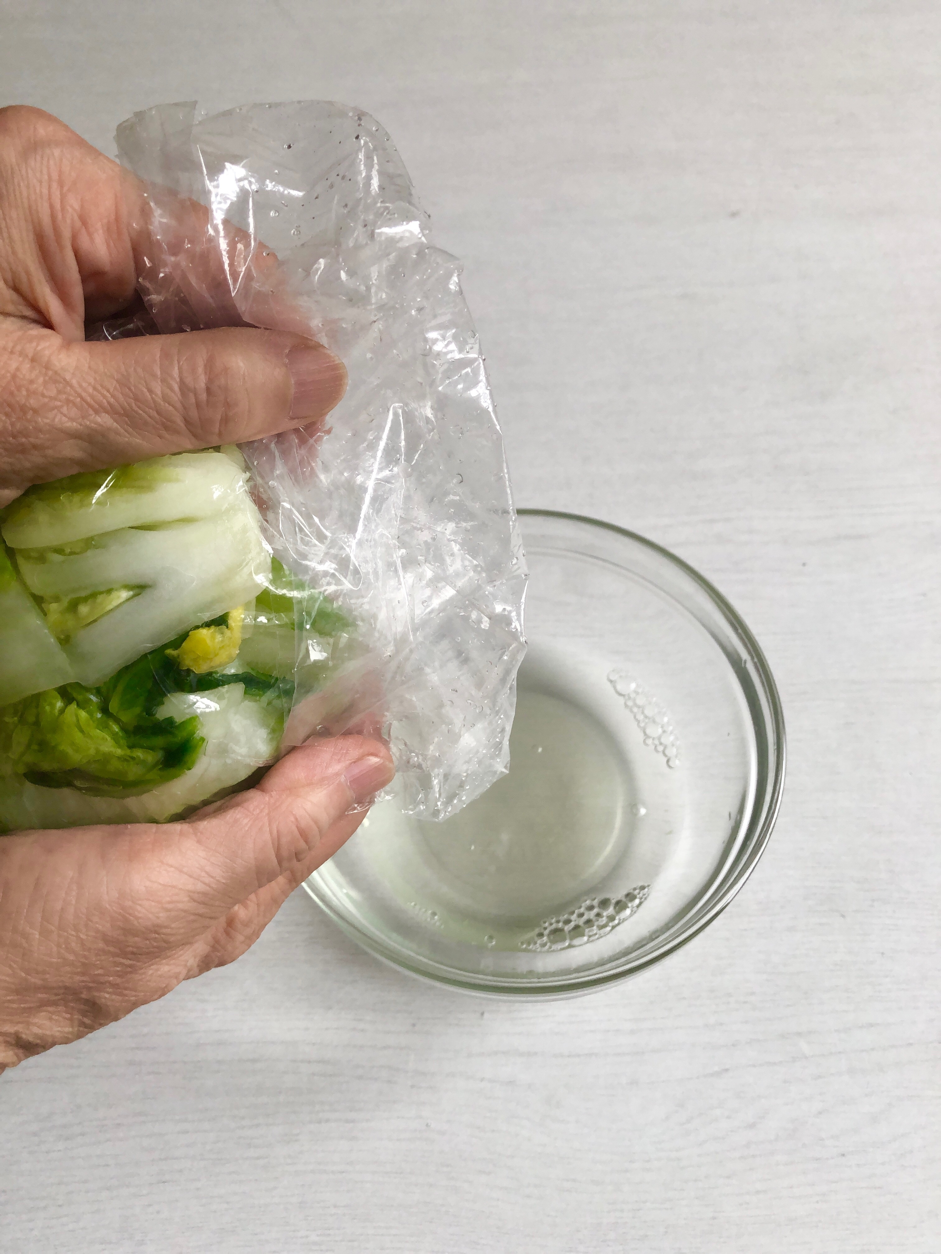 袋を逆さにしてギューッと絞り水分を捨てる。