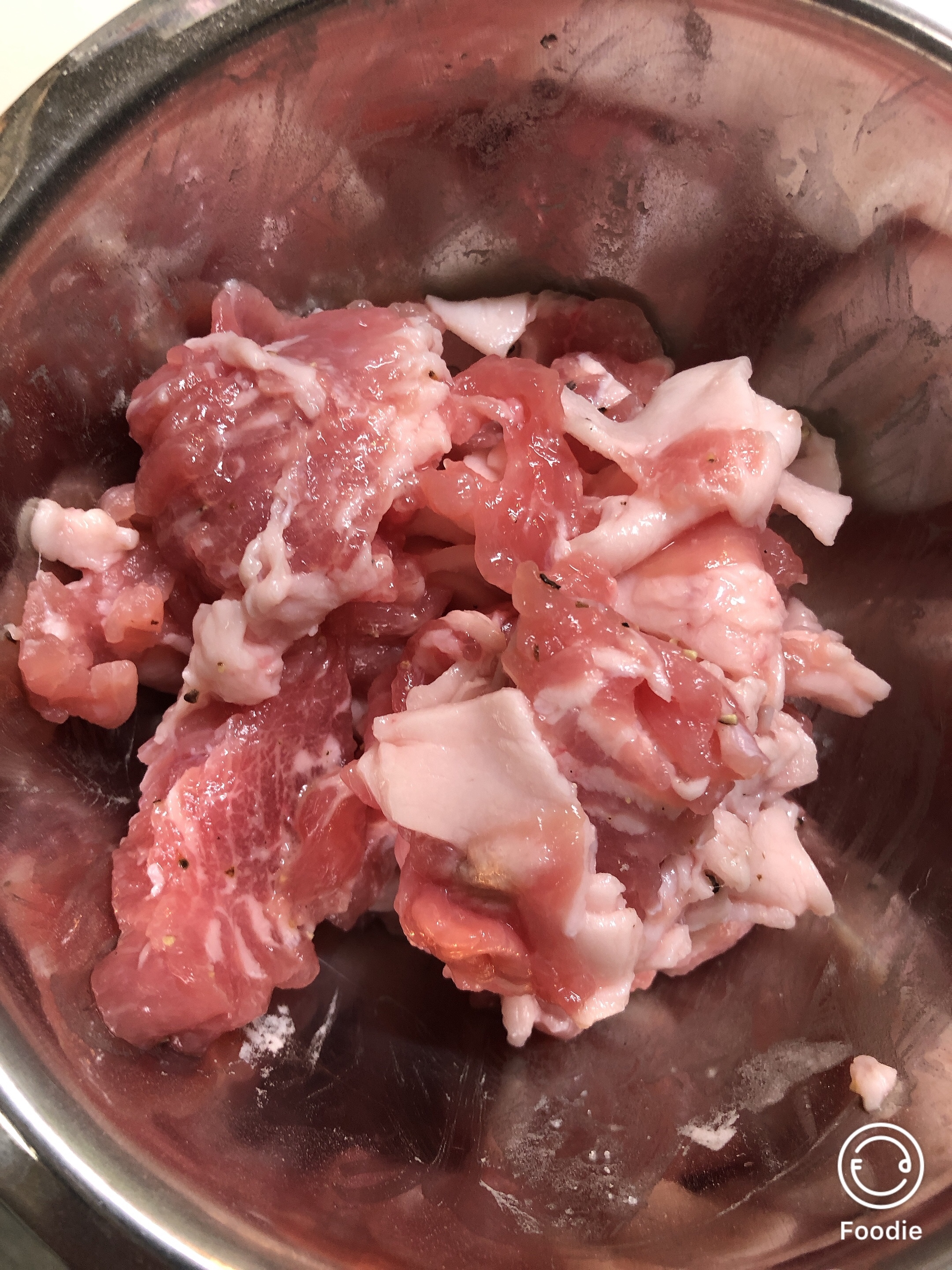 豚肉は細切りにし、ニンニク、酒、塩コショウ、片栗粉をあえておきます。