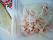 - 3 ボイルエビ、カニカマ、薄切り玉ねぎ、@印を入れて、混ぜ和えたら、出来上がり。