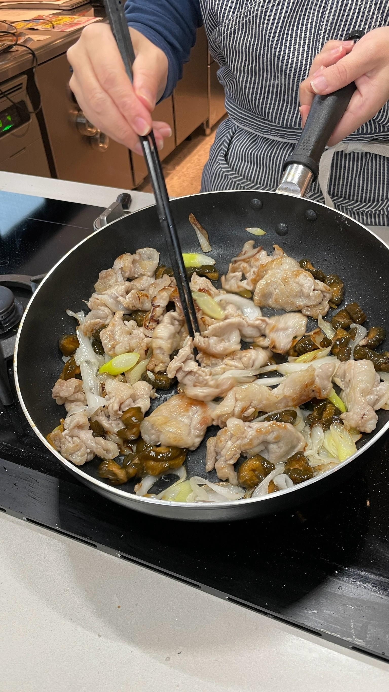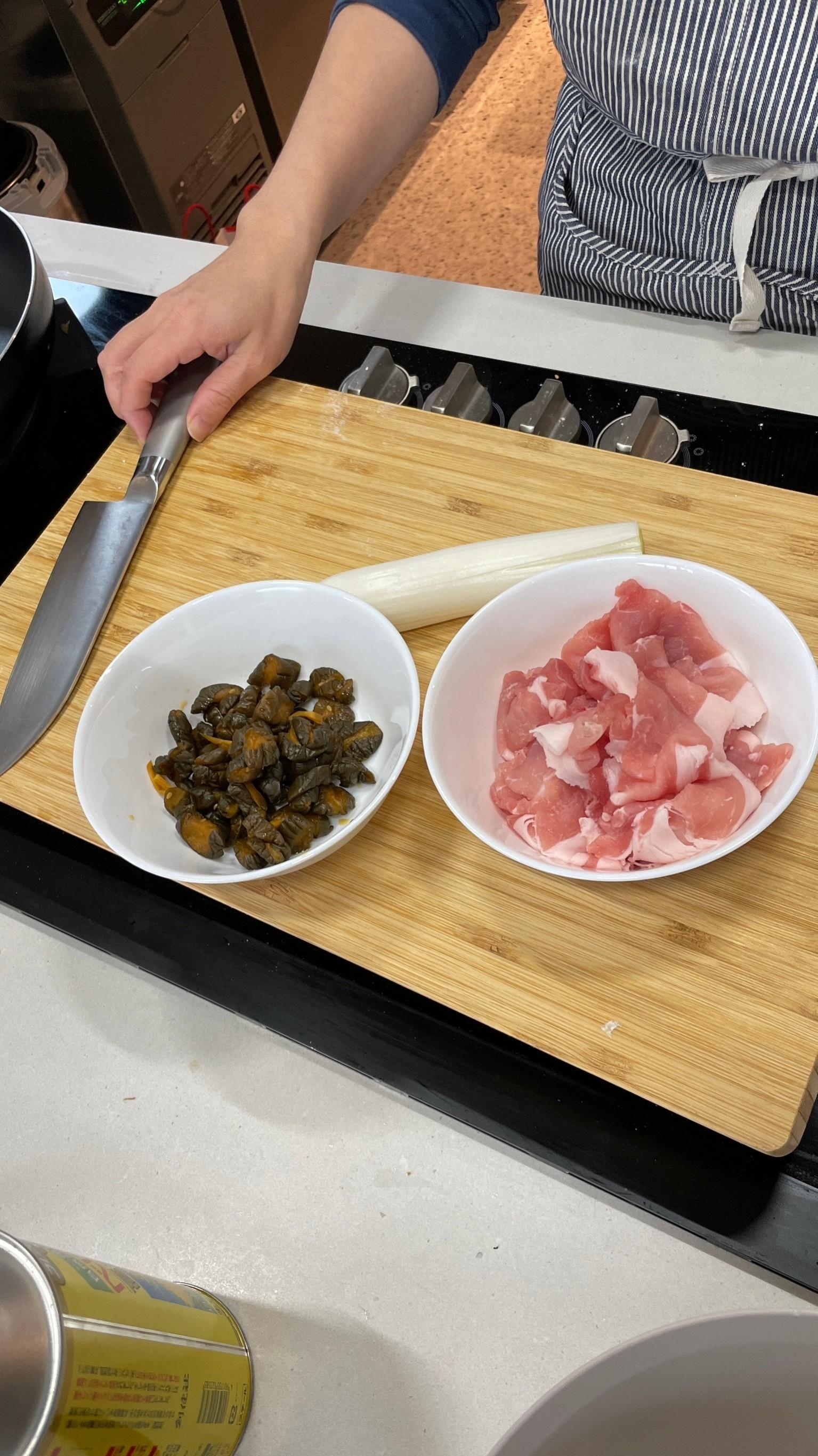 フライパンに油をひき、豚肉と長ネギを炒め、豚肉に火が通ったら漬物を加え、和える。