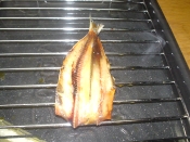イワシを塩水に漬けて一夜干しにし、焼いてみました。