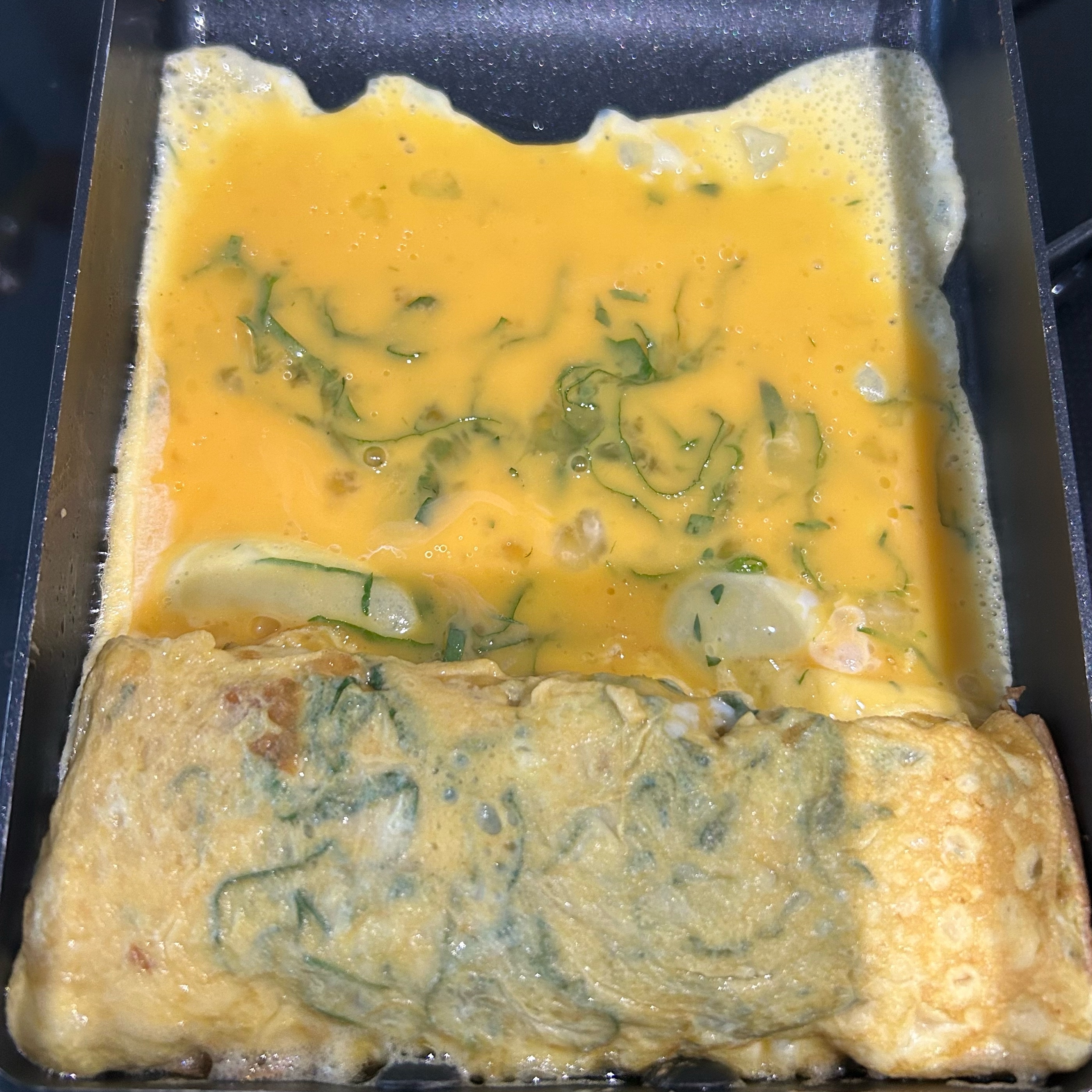 卵液を1/3程度流し入れ、巻き始めより少しずらしてカニカマを置き、後はいつも通りの手順で卵焼きを作っていく