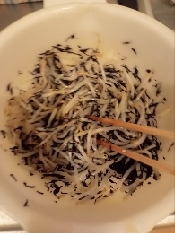 フライパンにひじきとひたひたの水を入れ中火にかける。沸騰したら火を止め5分おく。