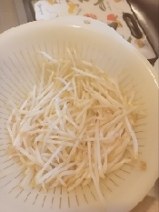 もやしはひげ根ととりザルで洗う。耐熱容器に入れ電子レンジ600wで2分加熱加熱する。水けをきっておく。
