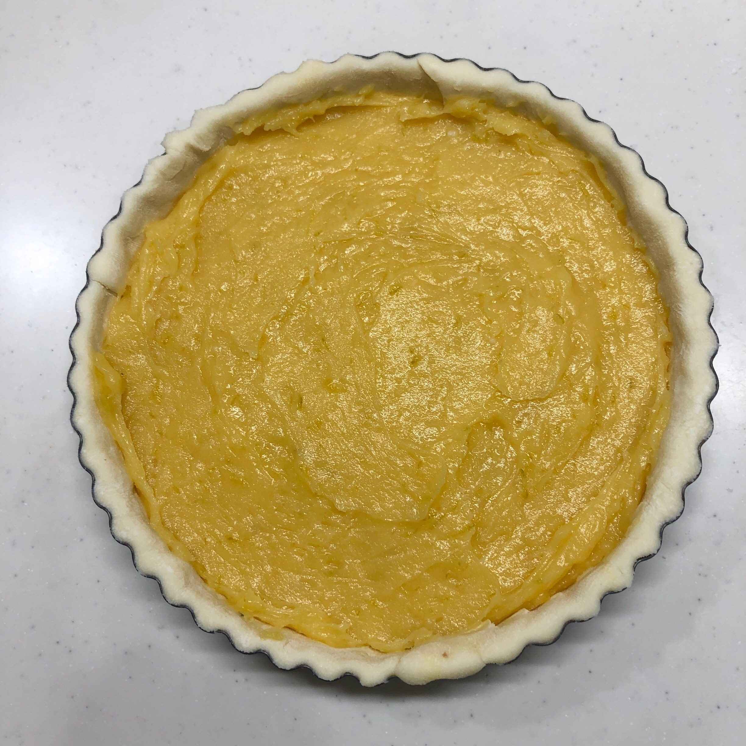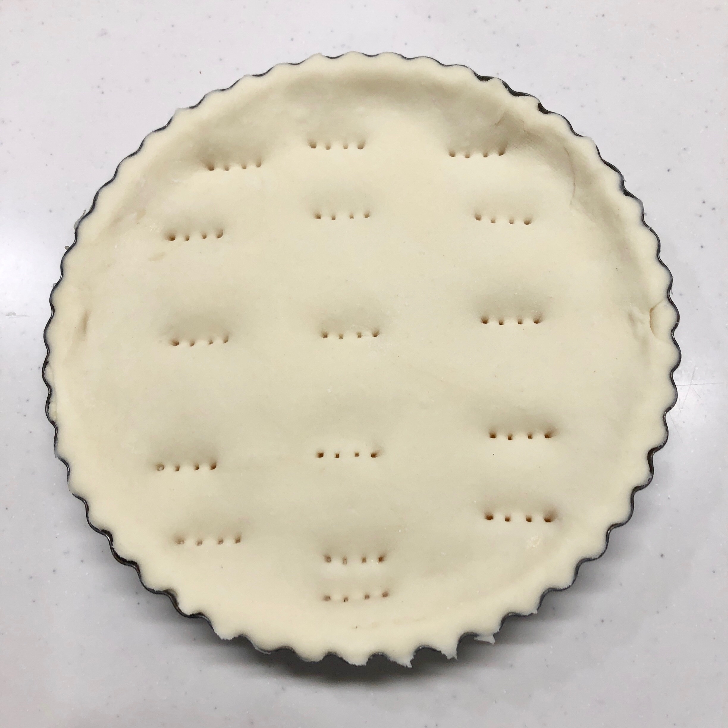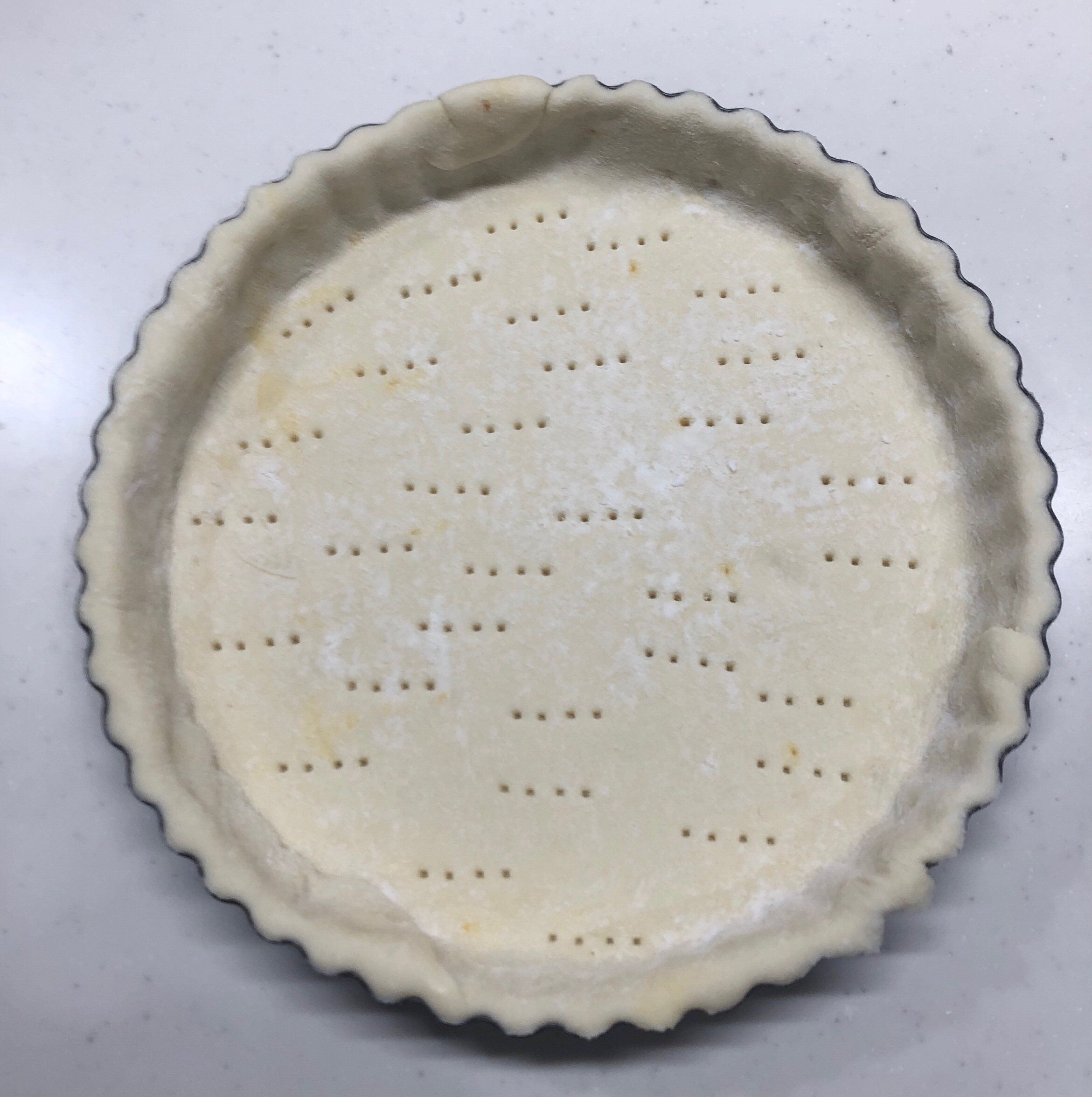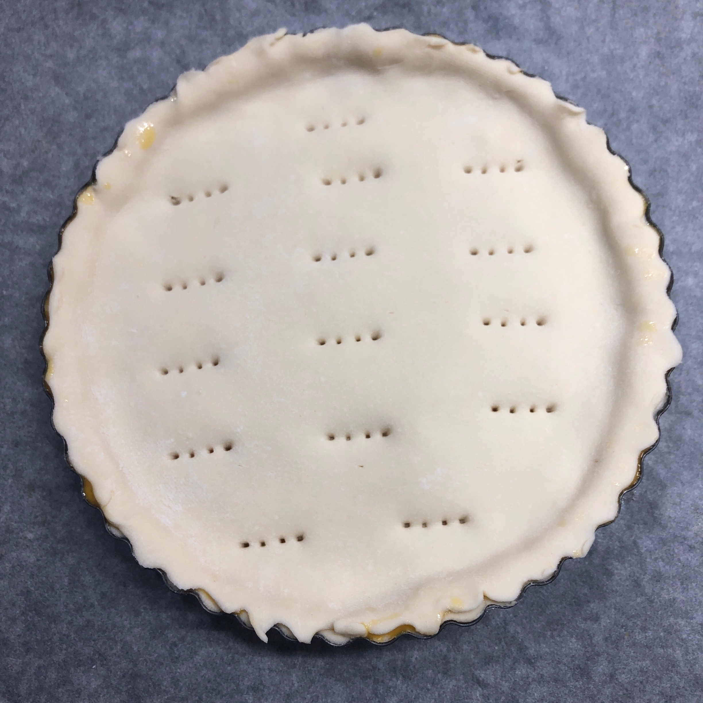 生地を伸ばしレモンカードの上に隙間がないように被せ、余分な生地をめん棒で落とし表面にフォークで穴を開けておく。