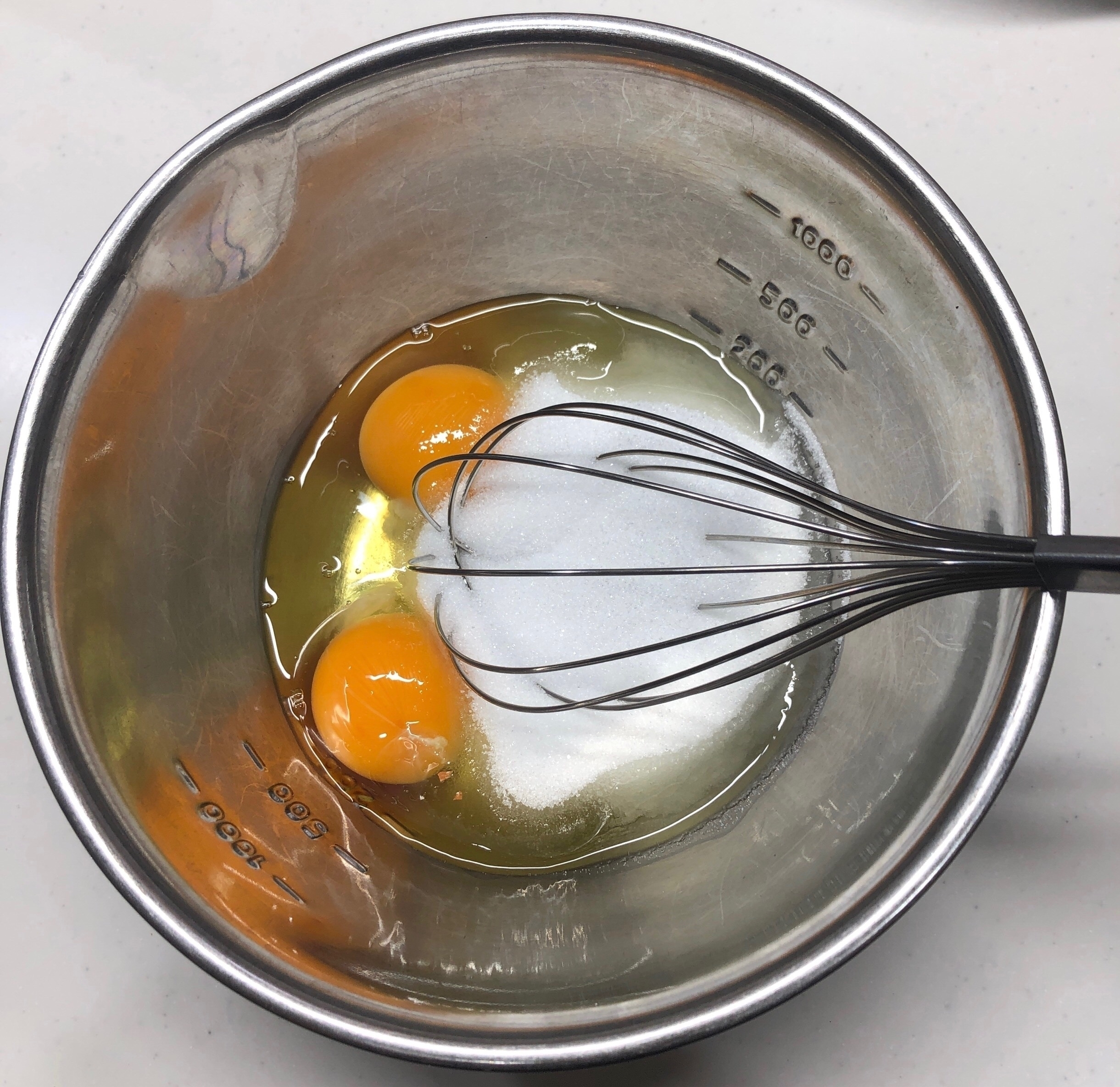 ボウルに、グラニュー糖、卵、コーンスターチを入れて泡立て器でよく混ぜる。