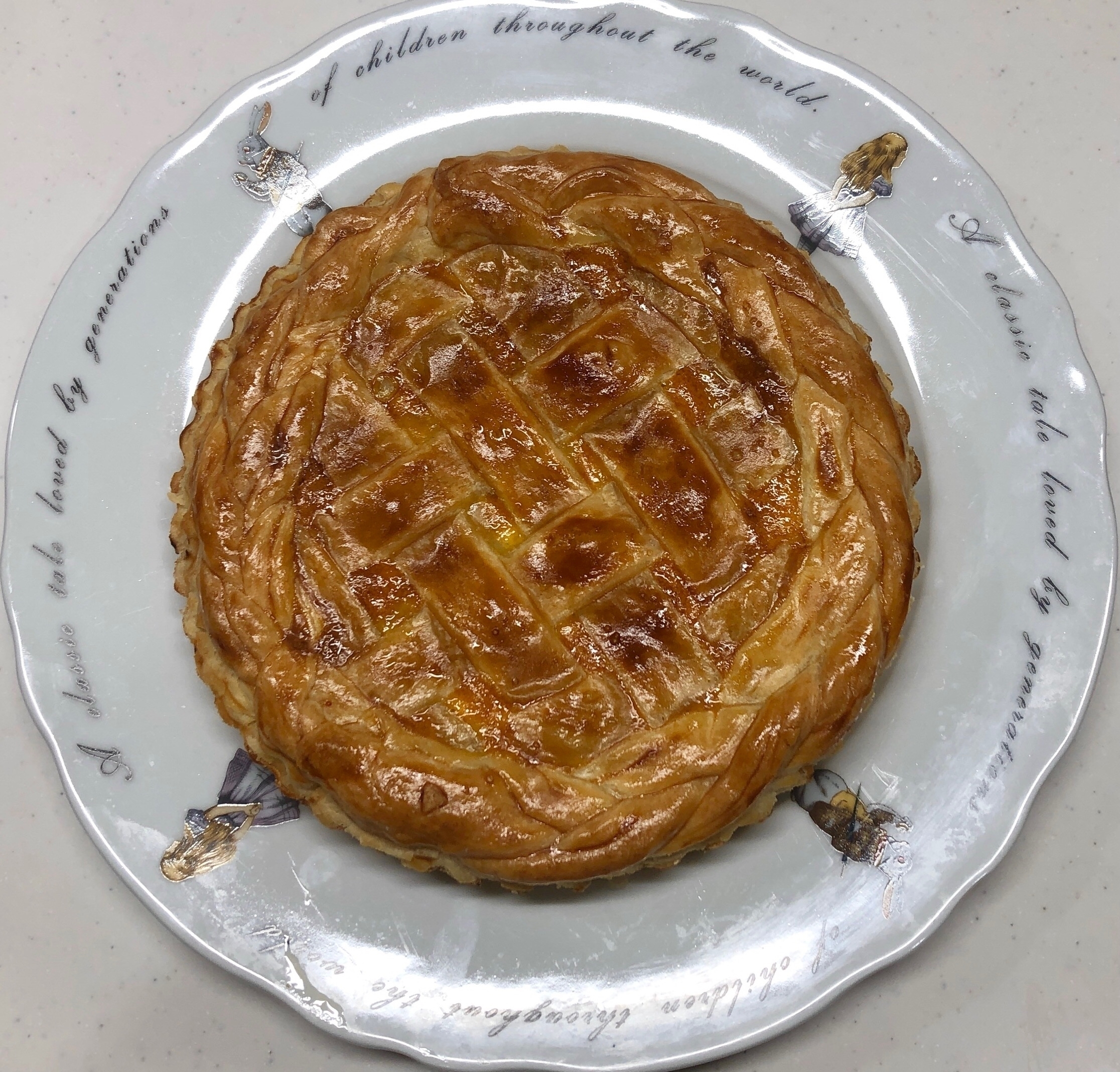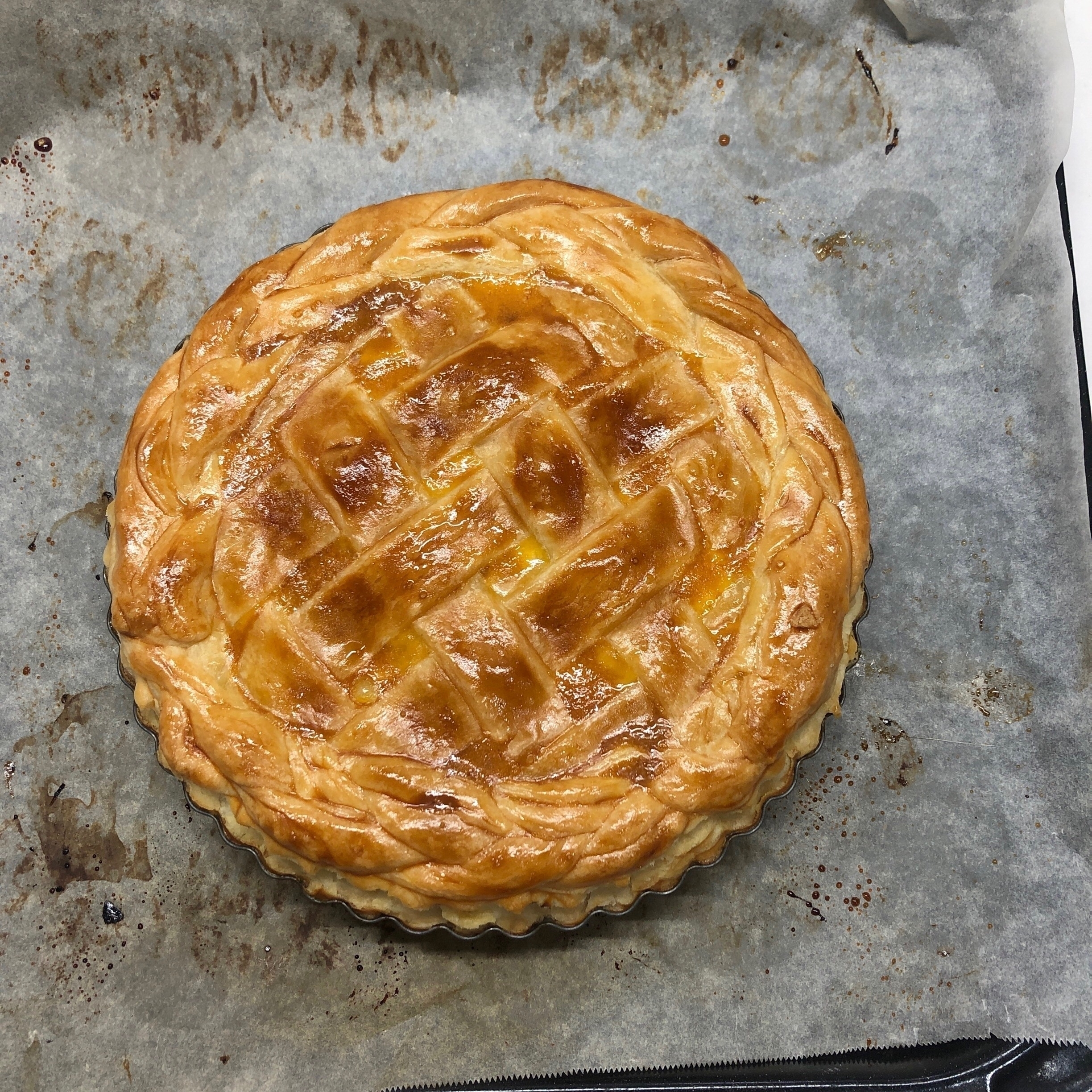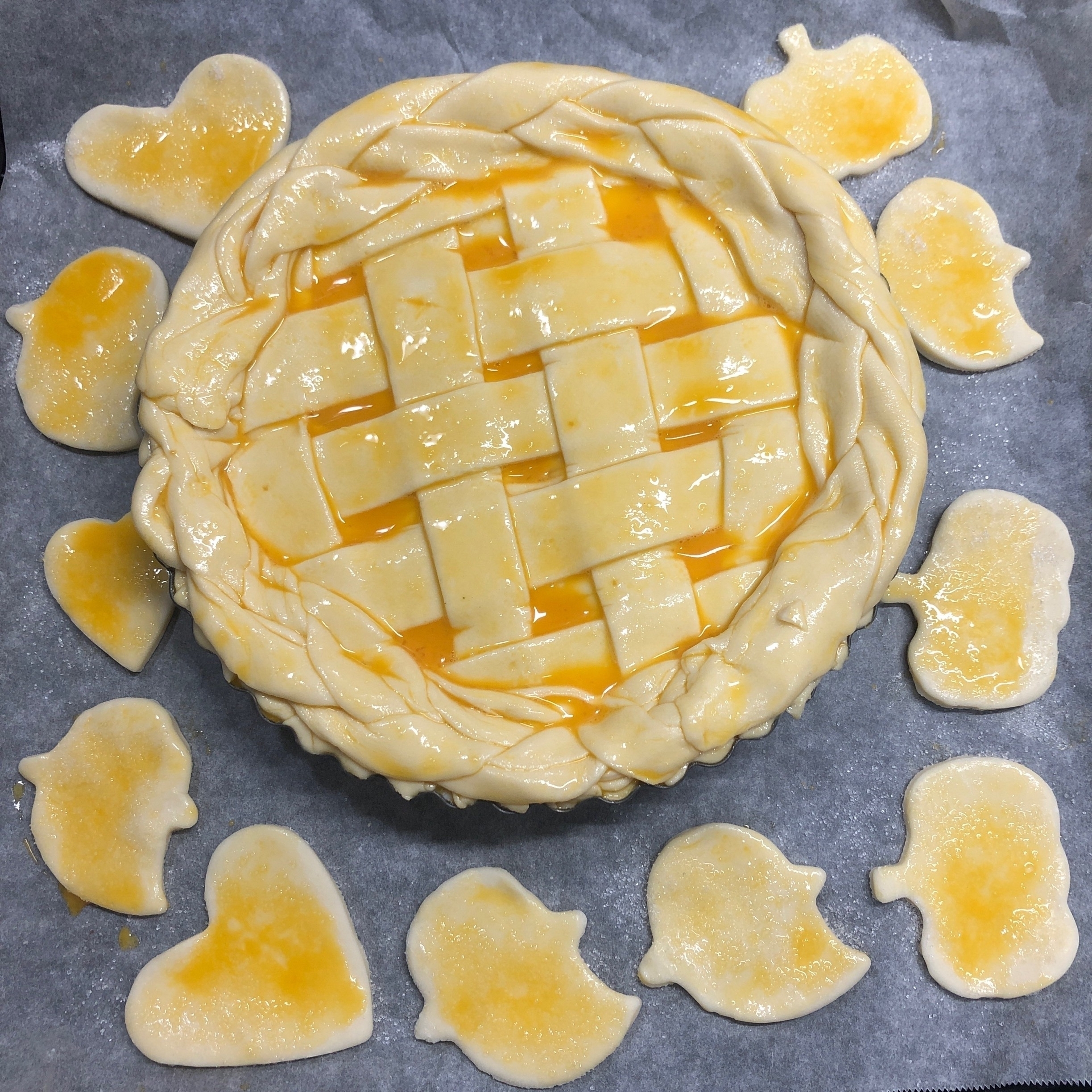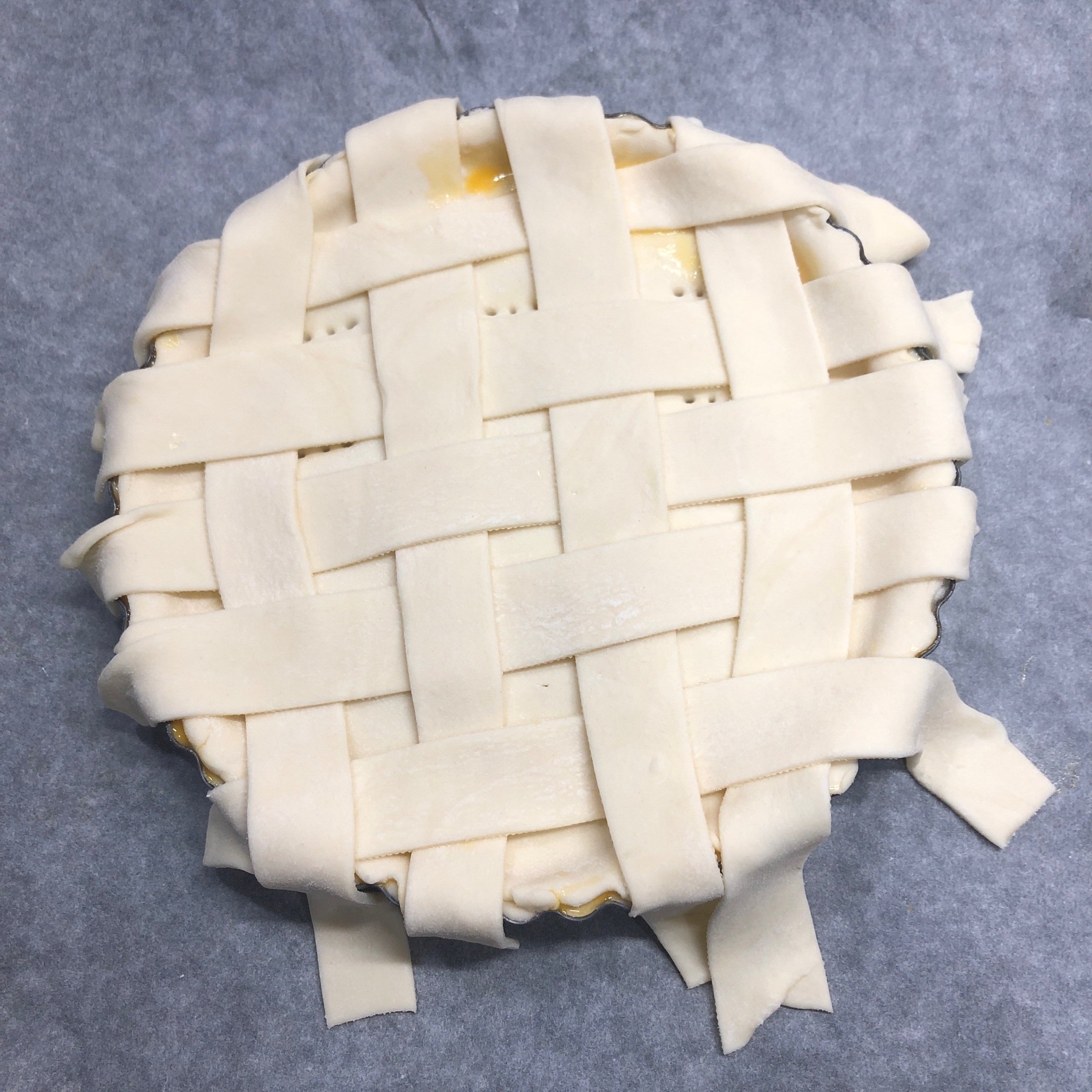 パイの表面に卵液をぬってから、手順「20」で作った三つ編み生地を周りにのせてかるく押さえ、三つ編みにも卵液をぬる。