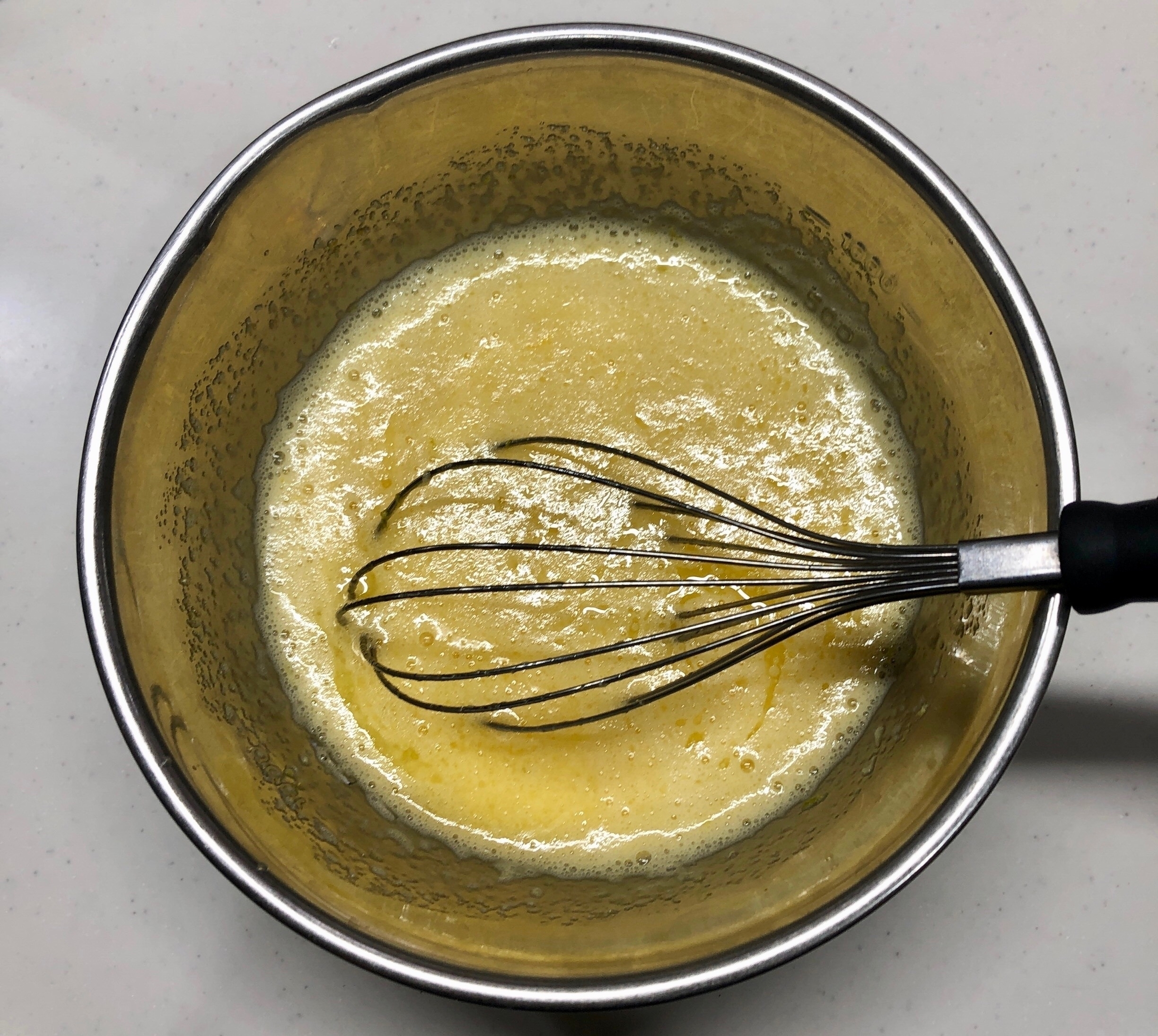 同じボウルに、「1」のレモン果汁と皮、「2」の溶かしたバターを加えよく混ぜ合わせる。