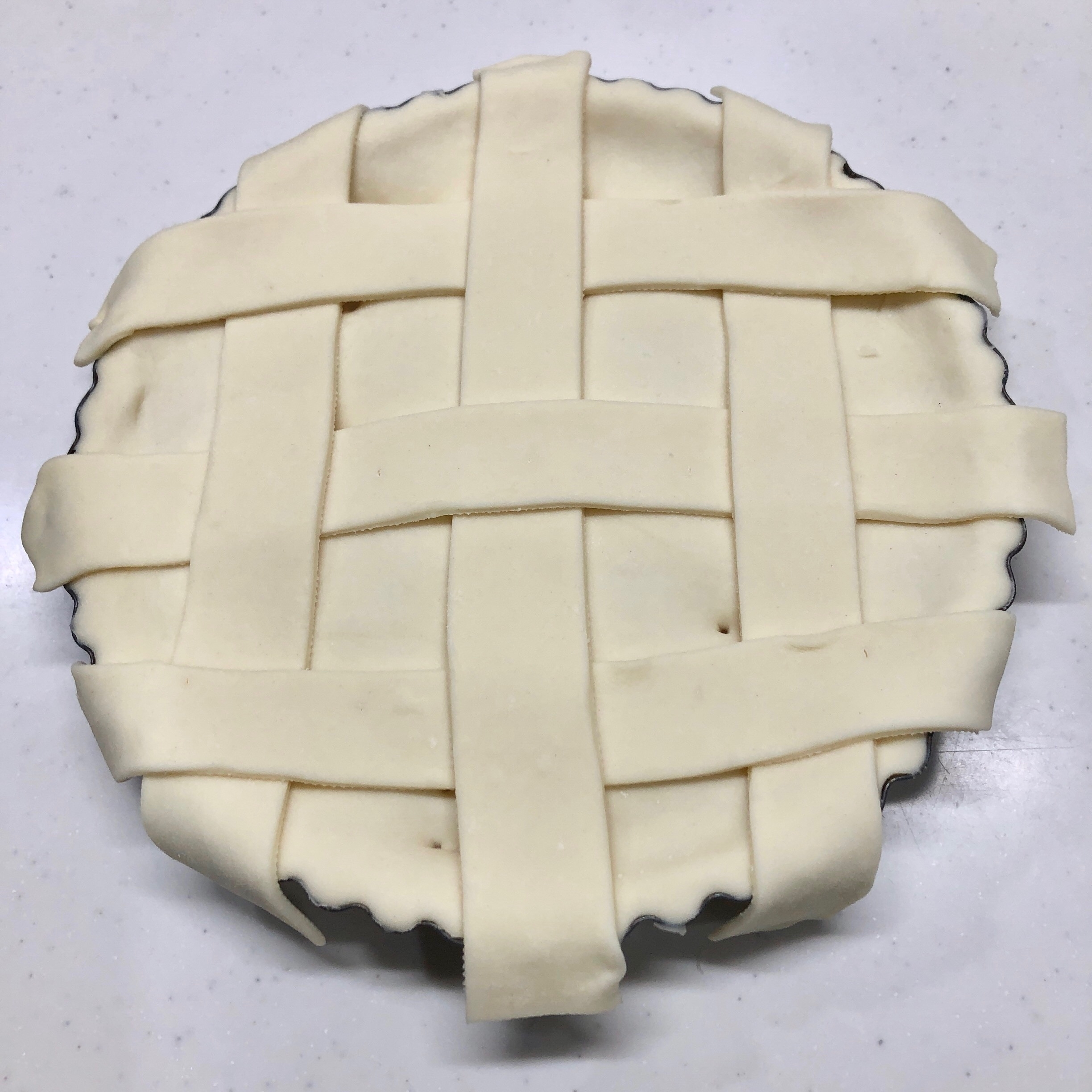 パイの表面であみ目に組み、余分な生地はめん棒で落とす。