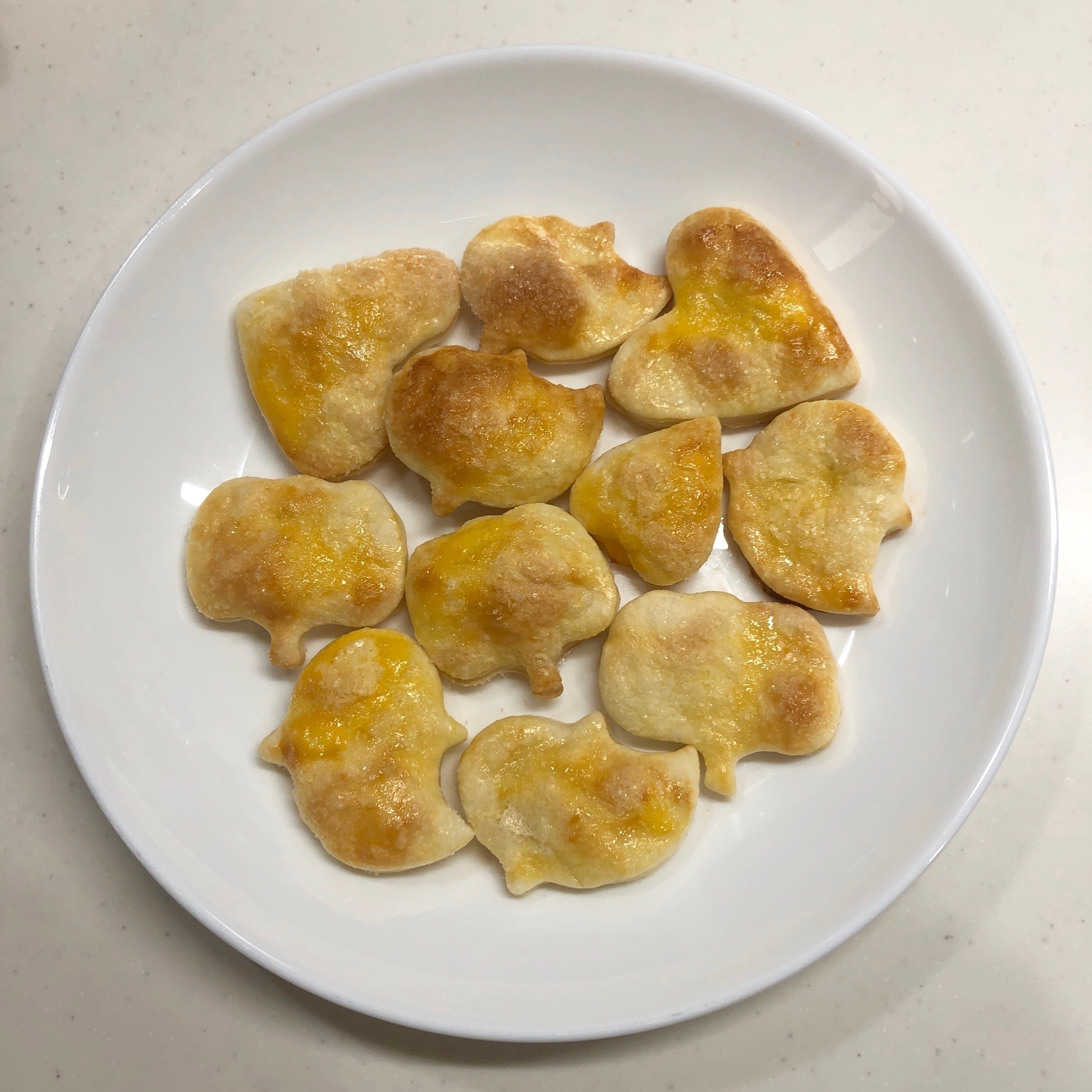 あまった生地は1つにまとめてめん棒でのばし、クッキー型で抜き、卵液をぬってグラニュー糖(分量外)をふり、クッキングシートを敷いた天板のまわりに並べる。