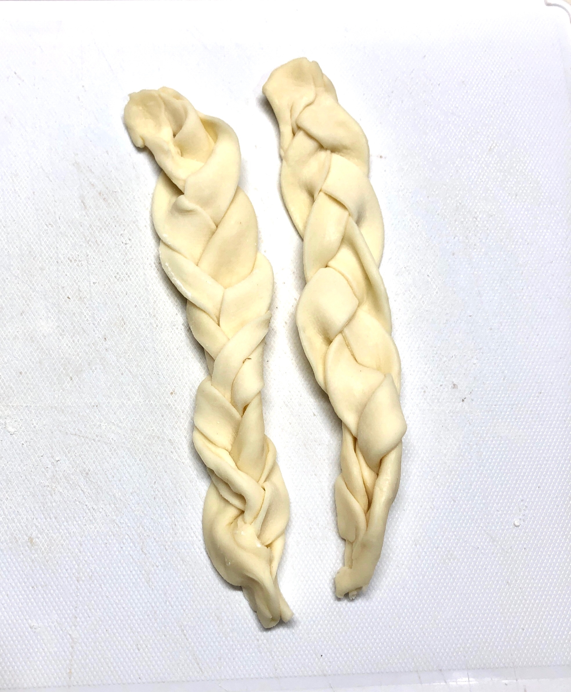 手順「8」「18」「19」であまった生地をまとめて伸ばしたら細長く切り、三つ編みを作る。