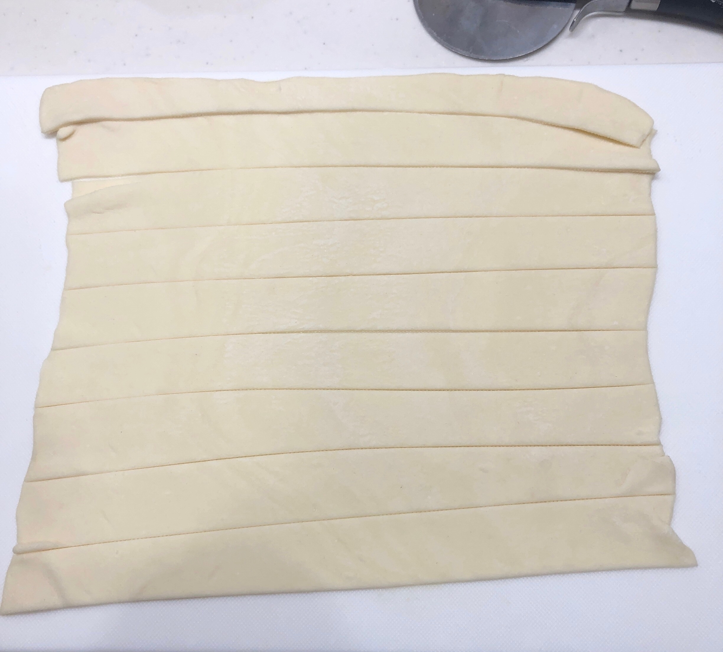 パイシートを1枚伸ばし、棒状に10本くらいに切る。