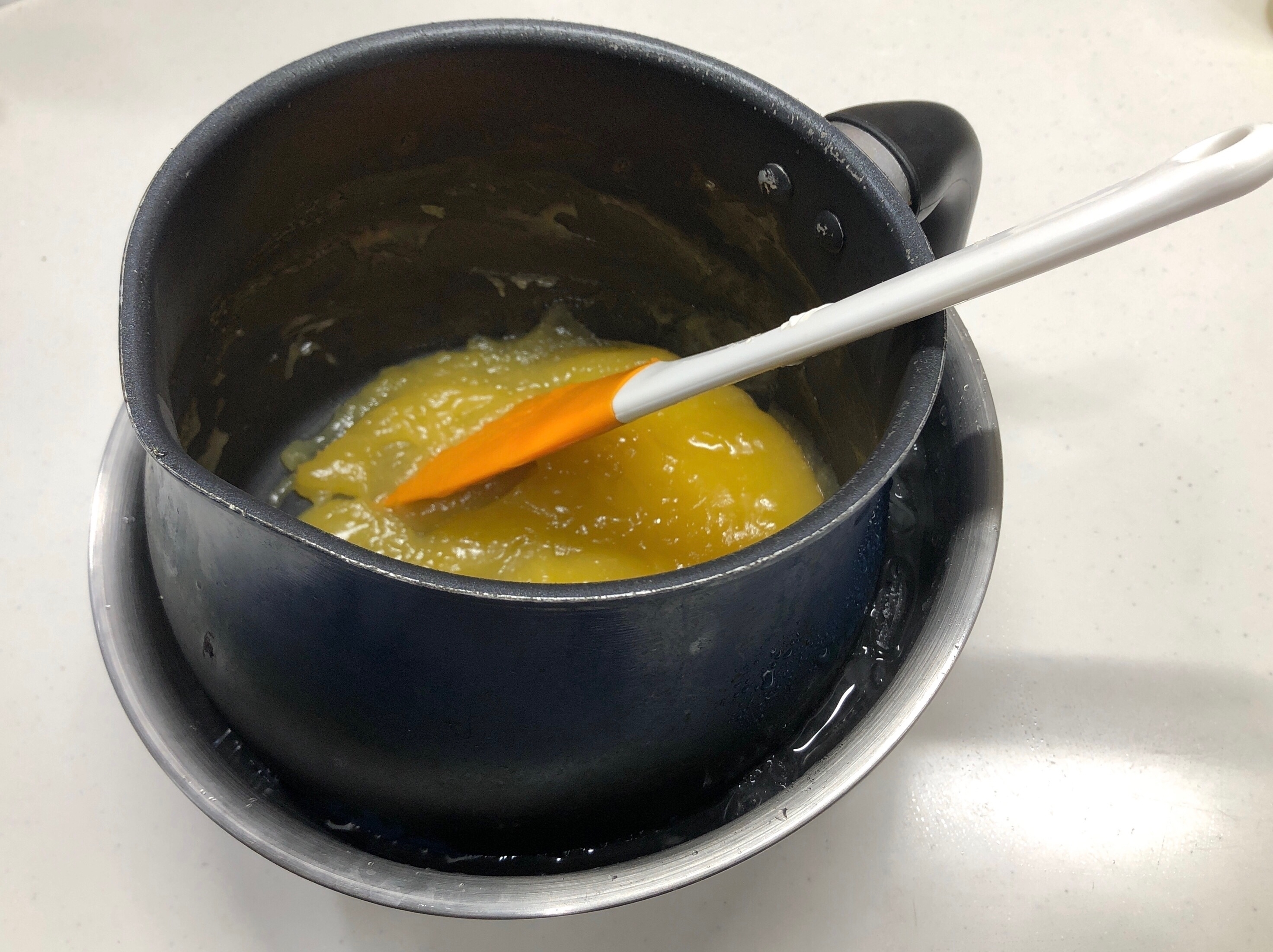 出来上がったレモンカード液をバターを溶かした鍋に戻し、中火でヘラで混ぜながら加熱する。