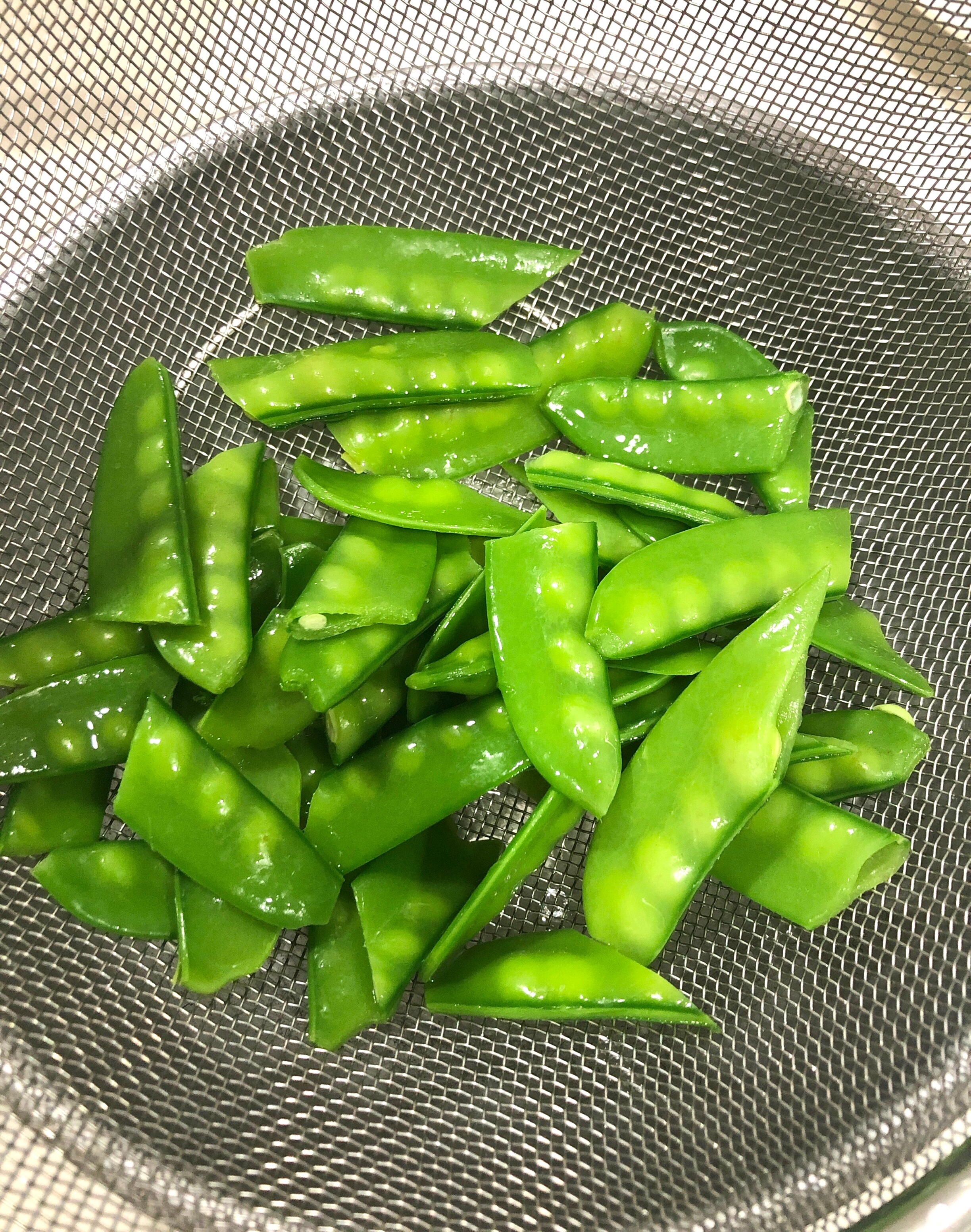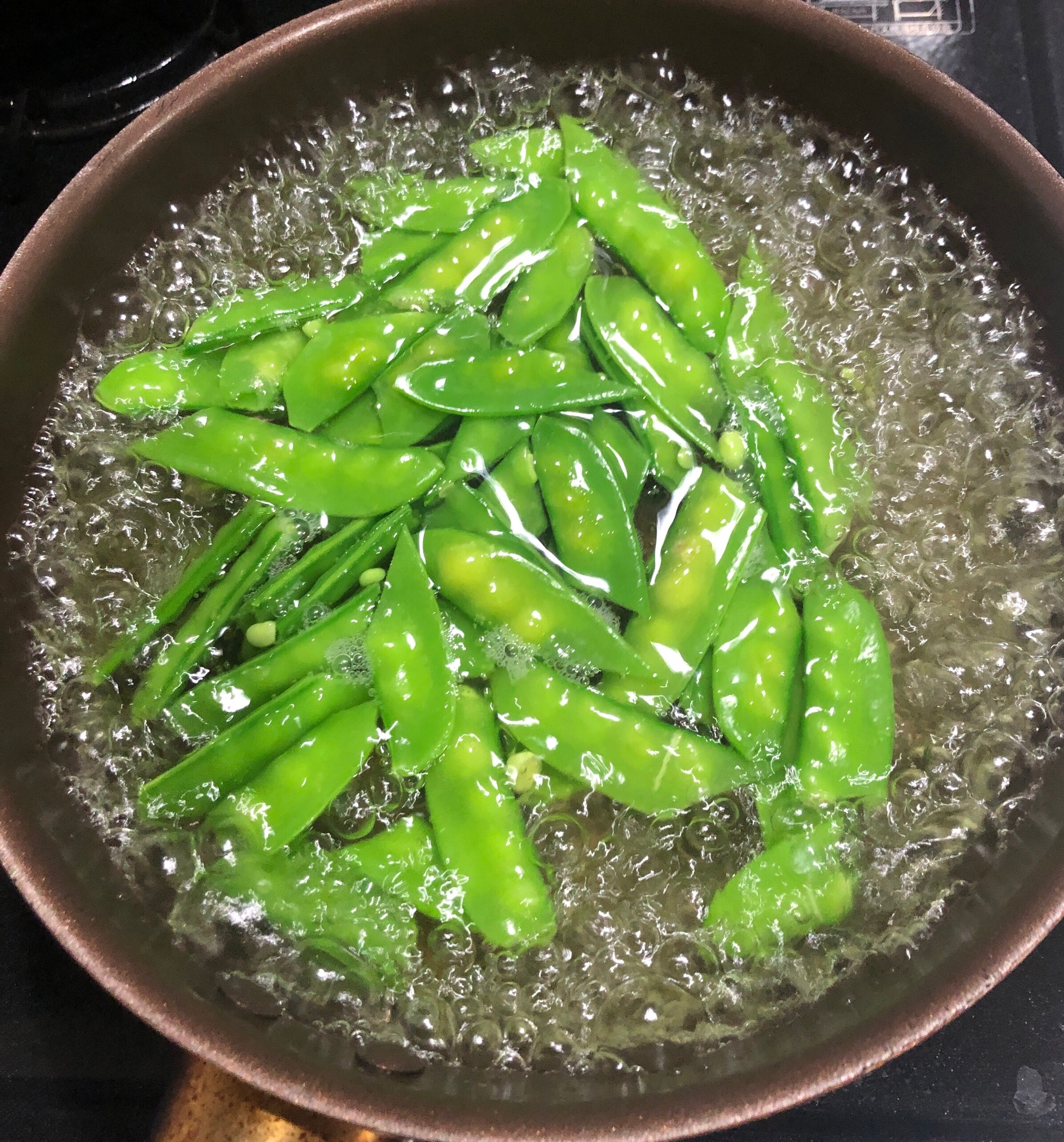 絹さやはスジを取り、沸騰させたお湯で1〜2分茹でます。
