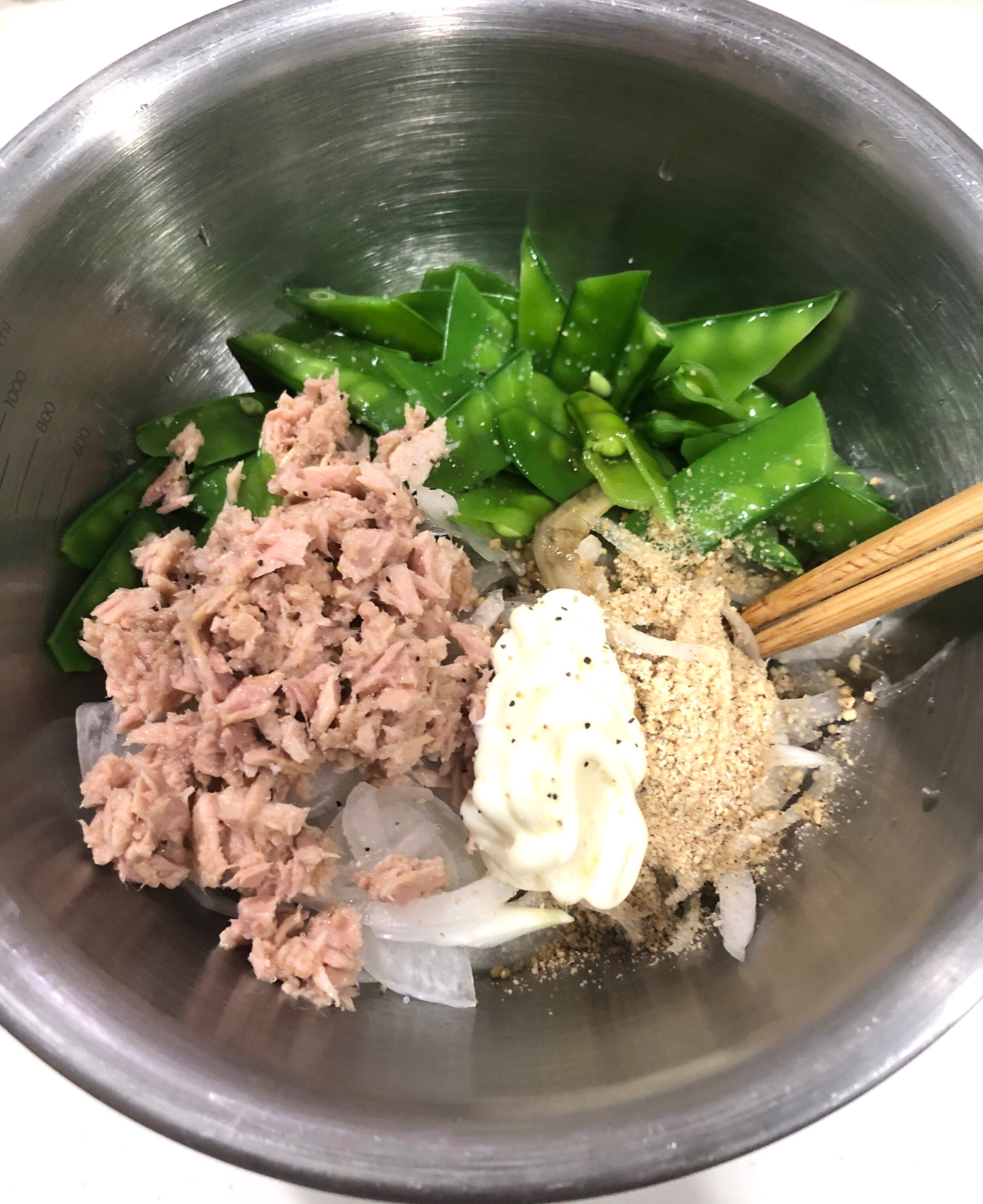 ボウルに水気をしっかり切った「1」の玉ねぎ、「3」の絹さや、ツナ缶(汁気を切る)、マヨネーズ、すりごま、塩こしょうを加えて混ぜ合わせます。