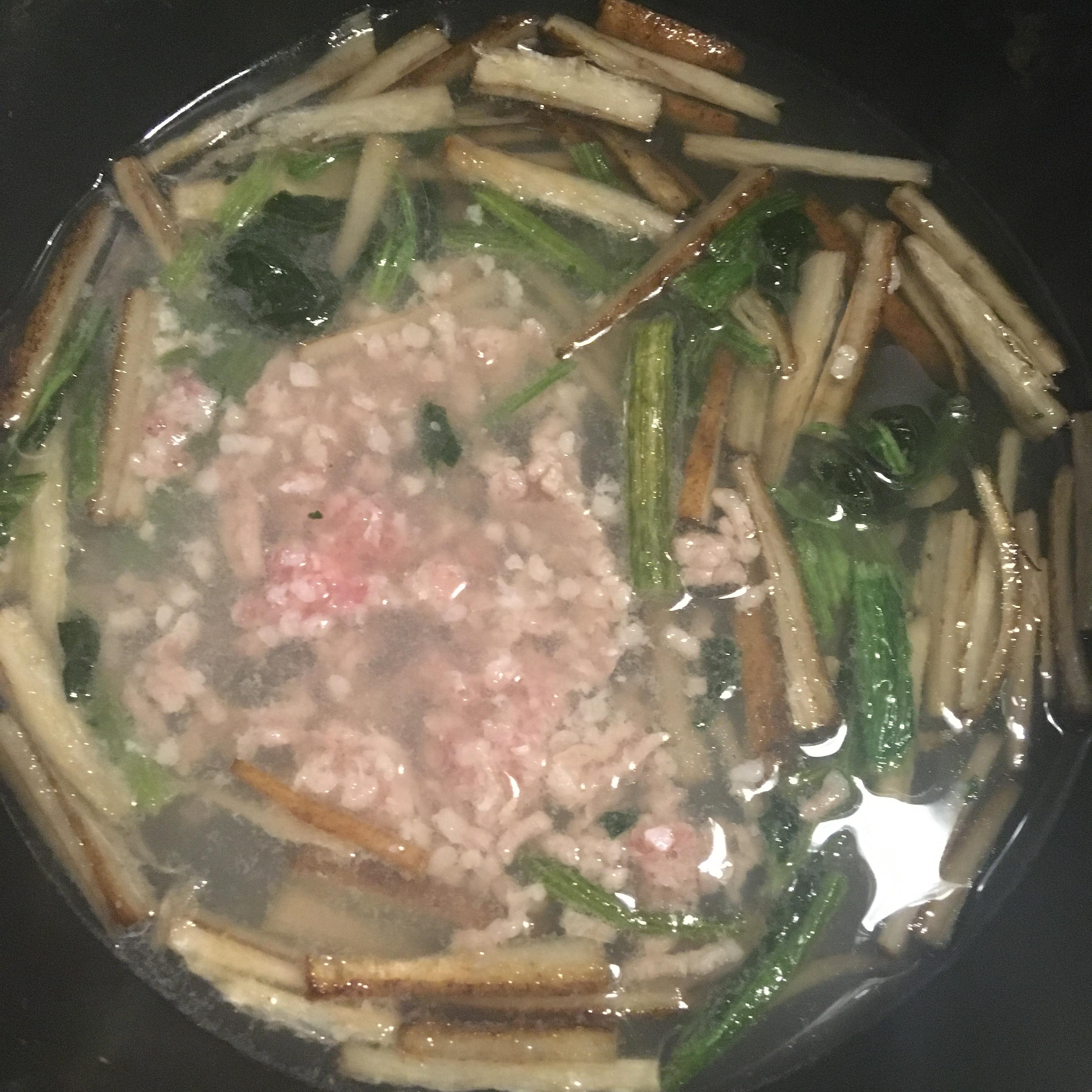 ごぼう、ほうれん草、豚肉、ミートソース汁そば レシピ・作り方