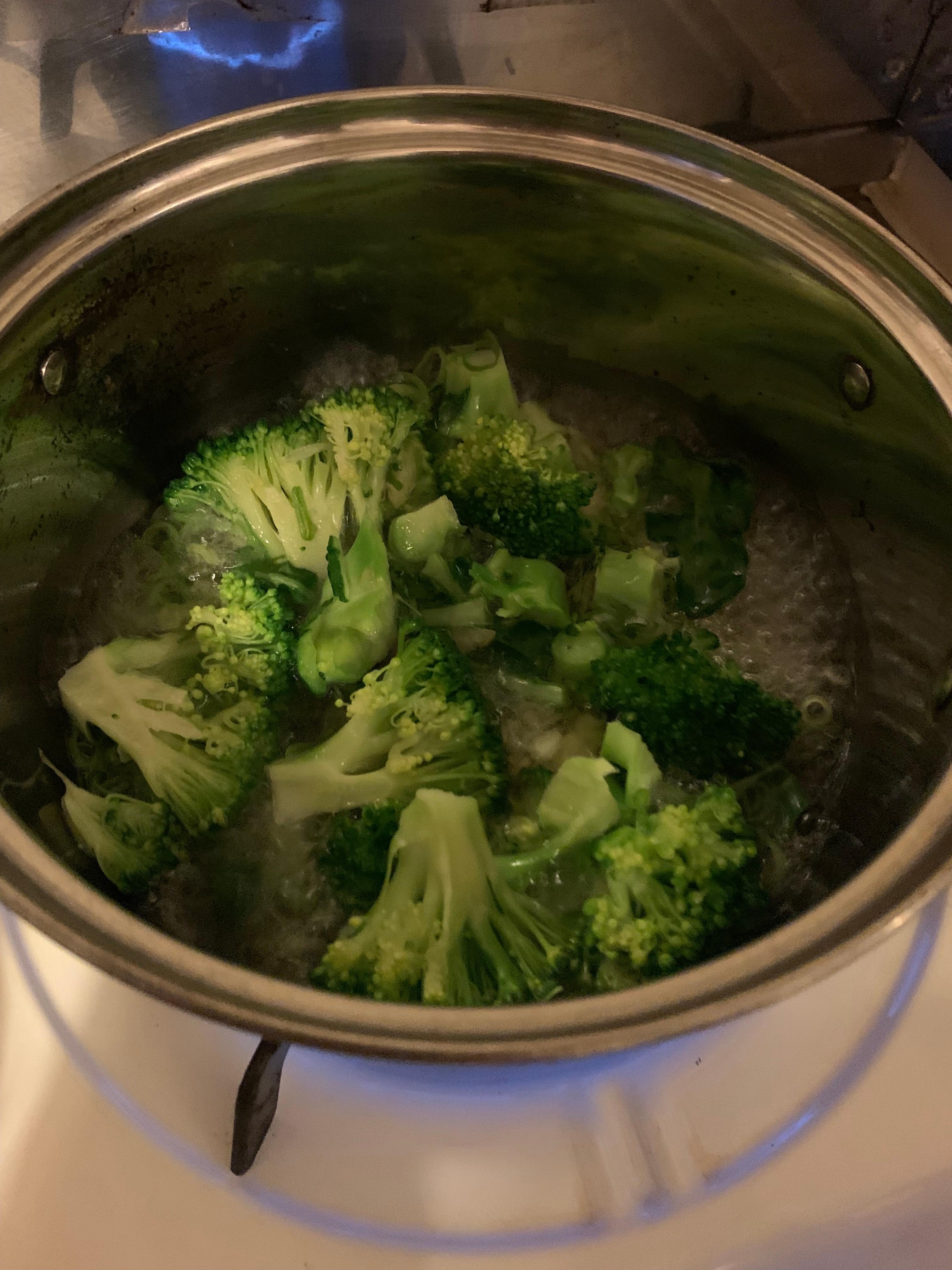 鍋に水をいれ、火にかけブロッコリーと粗めのみじん切りにした生姜をいれる。